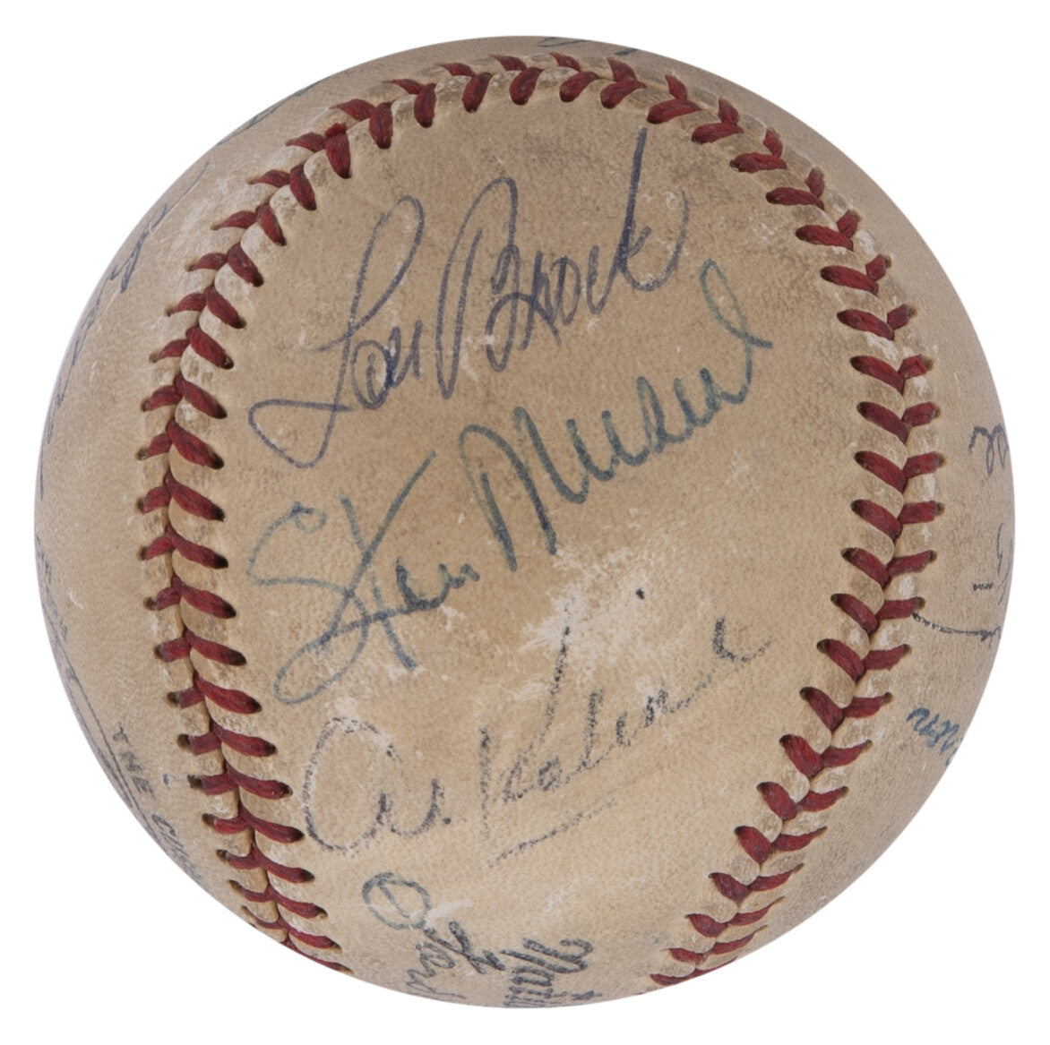 Official National League Ford C. Frick baseball that has been signed by 11 members of the prestigious 3,000 Hit Club. 11 signatures. Hall of Famer Tris Speaker has signed his name across the sweet spot in blue pen. The east panel has Hall of Famers Hank Aaron and Rod Carew (inscribed “8/4/85”), and Pete Rose (ch). Aaron’s signature is in blue, while Carew and Rose signed in black ink. The south panel has the blue ink signatures of Lou Brock, Stan Musial, and Al Kaline, while the west panel with the Spalding stamp has Willie Mays. The north panel has Hall of Famers Paul Waner, Roberto Clemente, and Carl Yastrzemski, all in blue pen. This comes with an LOA from PSA/DNA (T02494) for the signatures. You can easily add many of the living 3,000 hit club members and make this the most complete 3,000 hit club ball on earth.