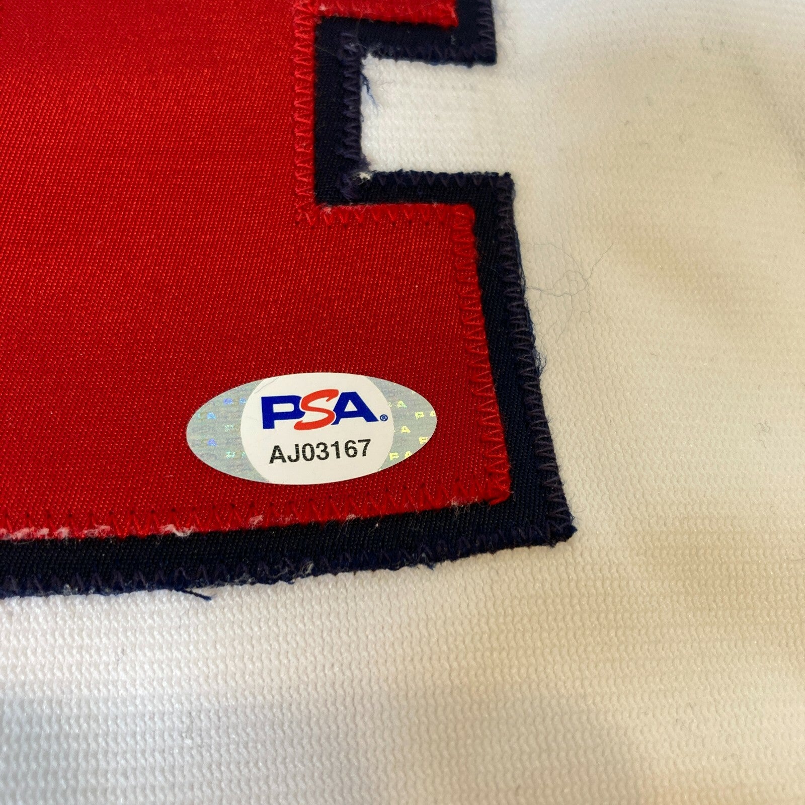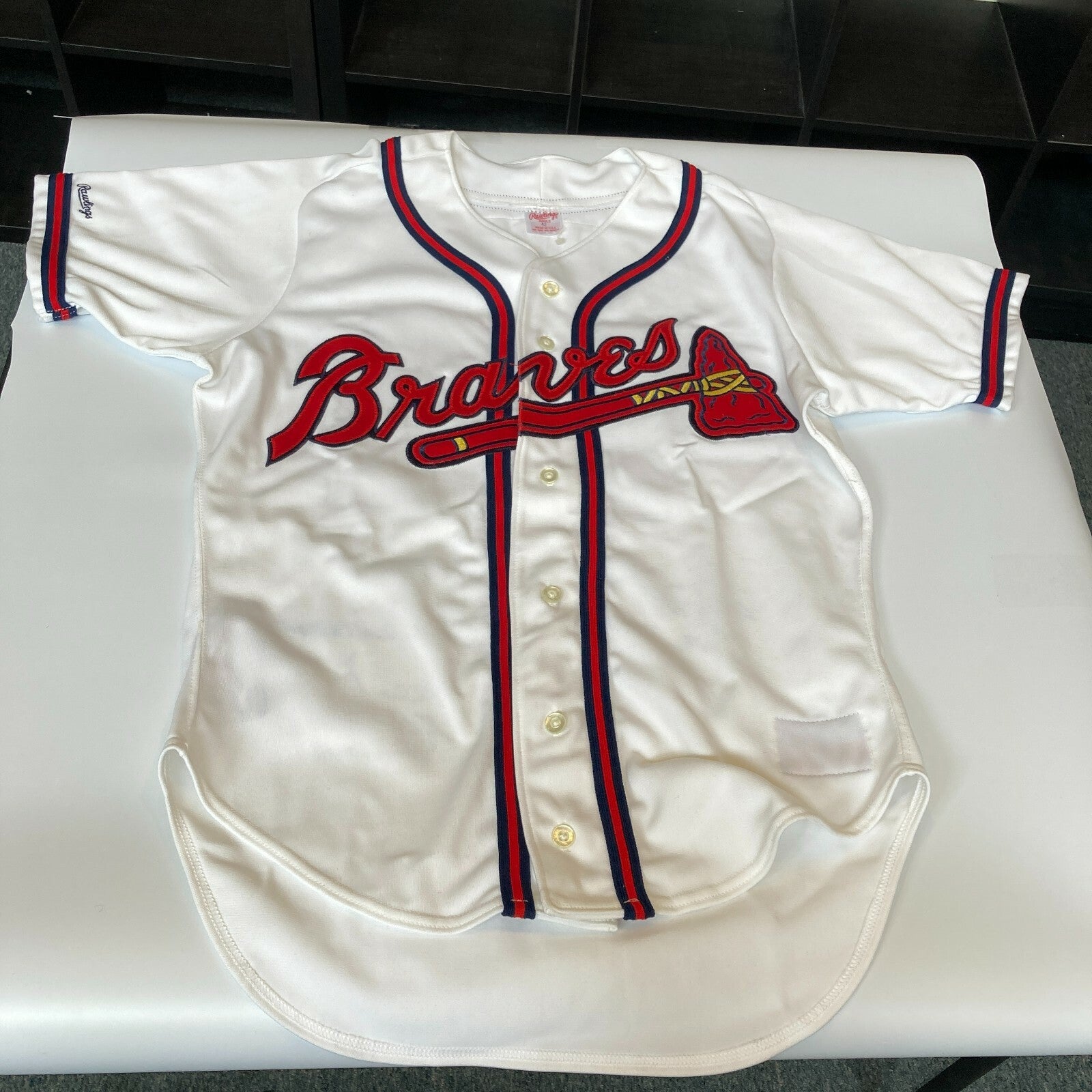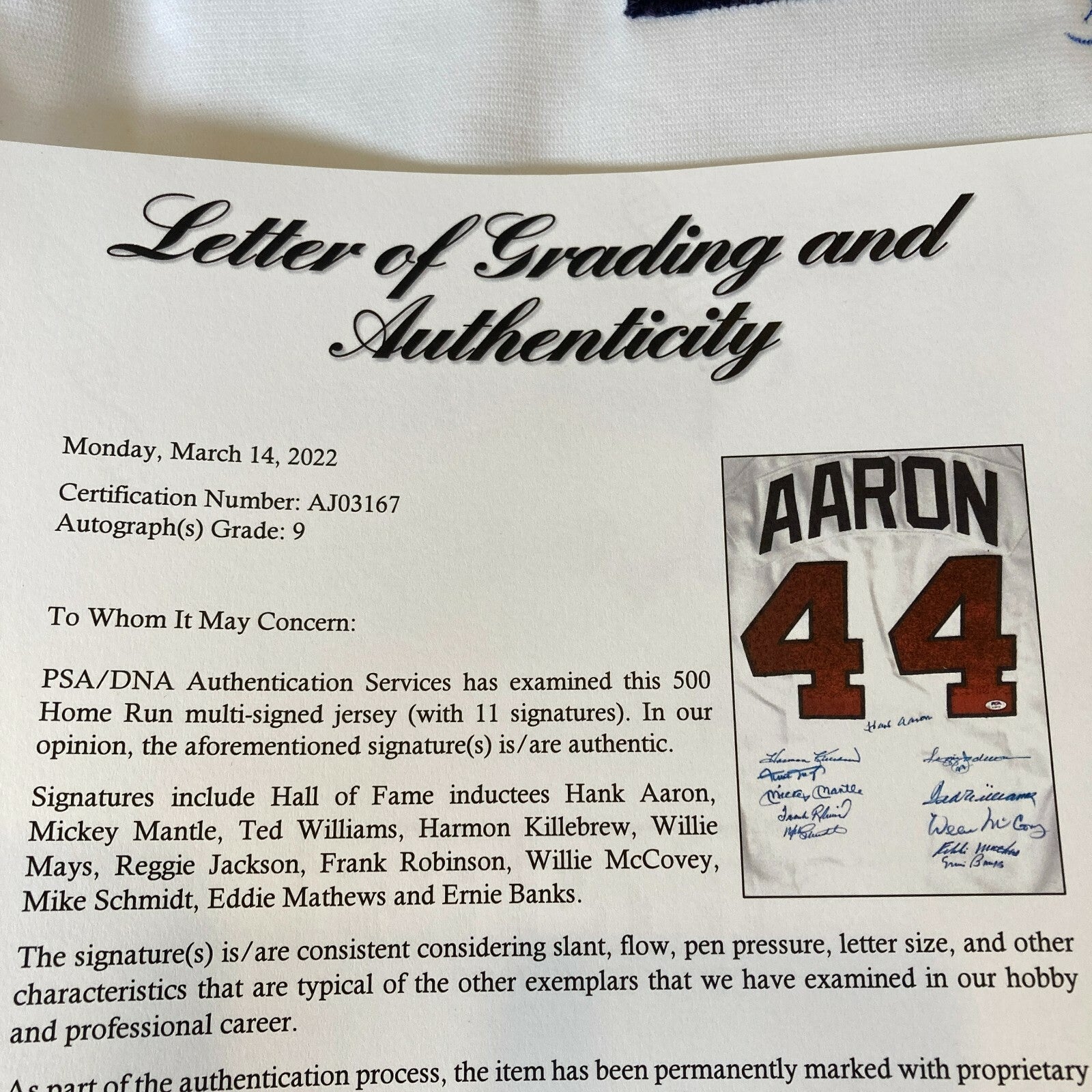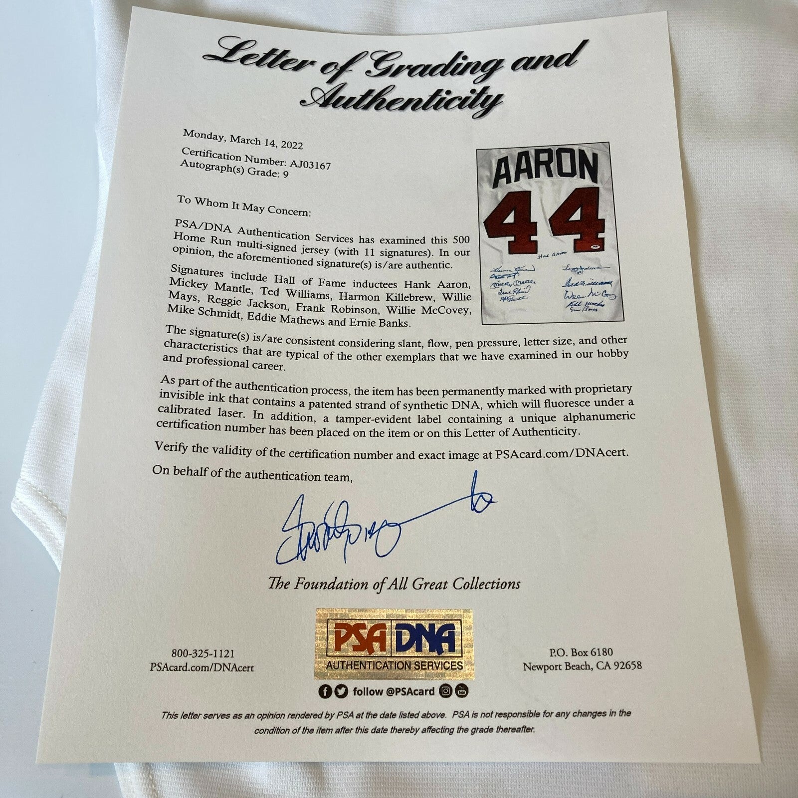 Presented here is an authentic Atlanta Braves game model home jersey with the late Hank Aaron’s name and number on the back. The jersey was made by Rawlings and is a size 42. “AARON” is sewn on in navy tackle twill on a matching white nameplate above his number “44”, which is sewn on in red and navy tackle twill. Below his number are 11 signatures from the exclusive 500 Home Run Club. All of the signatures have been signed with a blue fiber-tipped marker and include Hall of Famers Hank Aaron, Ted Williams, Mickey Mantle, Eddie Mathews, Reggie Jackson, Frank Robinson, Willie Mays, Harmon Killebrew, Mike Schmidt, Ernie Banks and Willie McCovey. This jersey comes with a LOA from PSA DNA for the signatures and a grade of MINT 9.