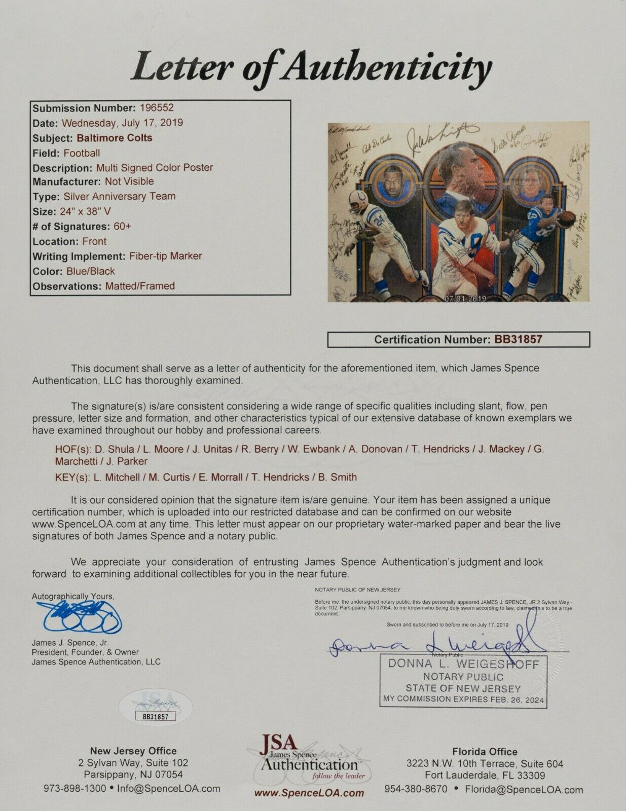 Chronicling the Colts’ tenure in Baltimore, it didn’t start well and it certainly didn’t end well. But in between, there were some glorious seasons in that Waverly neighborhood with Hall of Fame players, championship teams, the NFLs first cheerleaders and a dedicated marching band. With the better days behind the franchise, this 1979 Silver Anniversary display was autographed by (62) franchise staples. Framed to 27-1/4 x 40-1/4”, the colorful illustration is decorated with fiber tip pennings (many with uniform number inscriptions) and include: Sisto Averno, Raymond Berry, Bobby Boyd, Ordell Braase, Norm Bulaich, Raymond Chester, Mike Curtis, Art DeCarlo, John Diehl, Marty Domres, Art Donovan, John Dutton, Doug Eggers, Joe Ehrmann, Weeb Ewbank, Sam Havrilak, Alex Hawkins, Ted Hendricks, Roy Hilton, Eddie Hinton, Ken Huff, Roy Jefferson, Bert Jones, George Kunz, Bruce Laird, Tony Linhart, Tony Lorick, Lenny Lyles, John Mackey, Gino Marchetti, Ted Marchibroda, Tom Matte, Tommy Maxwell, Don McCauley, Randy McMillan, Lou Michaels, Fred Miller, Lydell Mitchell, Lenny Moore, Earl Morrall, Jim Mutscheller, Andy Nelson, Tom Nowatzke, Buzz Nutter, Jim O’Brien, Jimmy Orr, Jim Parker, Robert Pratt, Willie Richardson, Sanders Shivers, Don Shula, Bubba Smith, Mike Sommers, Howard Stevens, Dick Szymanski, Bill Troup, Johnny Unitas, Rick Volk, Jackie Wallace, Joe Washington, Stan White and Elmer Wingate. Accompanying is a full photo LOA from JSA.