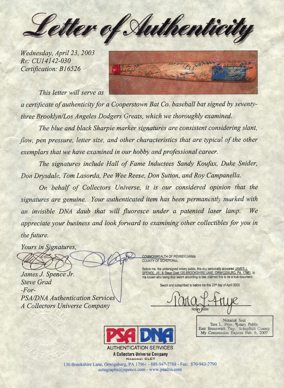 With a colorful franchise logo and printed pennant and World Series identifiers, this Cooperstown Bat Co. “Major League Team Series” Los Angeles Dodgers keepsake has added appeal in the form of (73) autographs of franchise greats! Executed throughout the barrel in blue marker, signatures highlights include: Cal Abrams, D. Baker, Bragan, Ralph Branca, Dolph Camilli, Roy Campanella, Campanis, Ron Cey, Cimoli, Connors, Coscarart, Craig, Dapper, T. Davis, Demeter, Don Drysdale, Carl Erskine, Ferguson, Steve Garvey, Gentile, Gibson, Gionfriddo, Gray, Hermanski, Orel Hershiser (inscribed “55”), Holmes, Hough, Frank Howard, Howe, L. Johnson, Johnstone, Kipp, Sandy Koufax, Clem Labine, Landreaux, Larker, Tommy Lasorda, Law, Loes, V. Lombardi, Lopes, Mauch, McLish, Monday, Moon, B. Morgan, Pafko, W. Parker, Pignatano, Podres, Pee Wee Reese, Reuss, Roseboro, B. Russell, Scioscia, L. Sherry, R. Smith, Snider, C. Snyder, Sosa, D. Stewart, Strawberry, Sudakis, Don Sutton, R. Valdez, B. Wade, Whitman, Dick Williams, Wills and Yeager. Full photo LOA from PSA DNA.