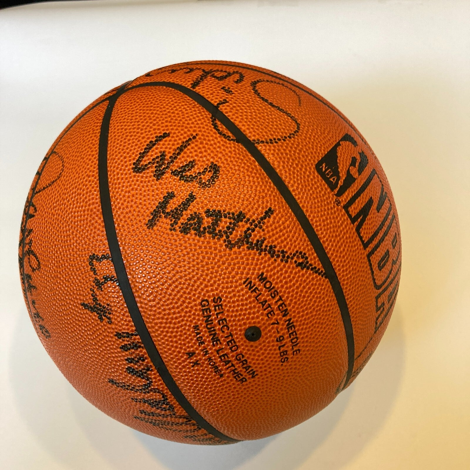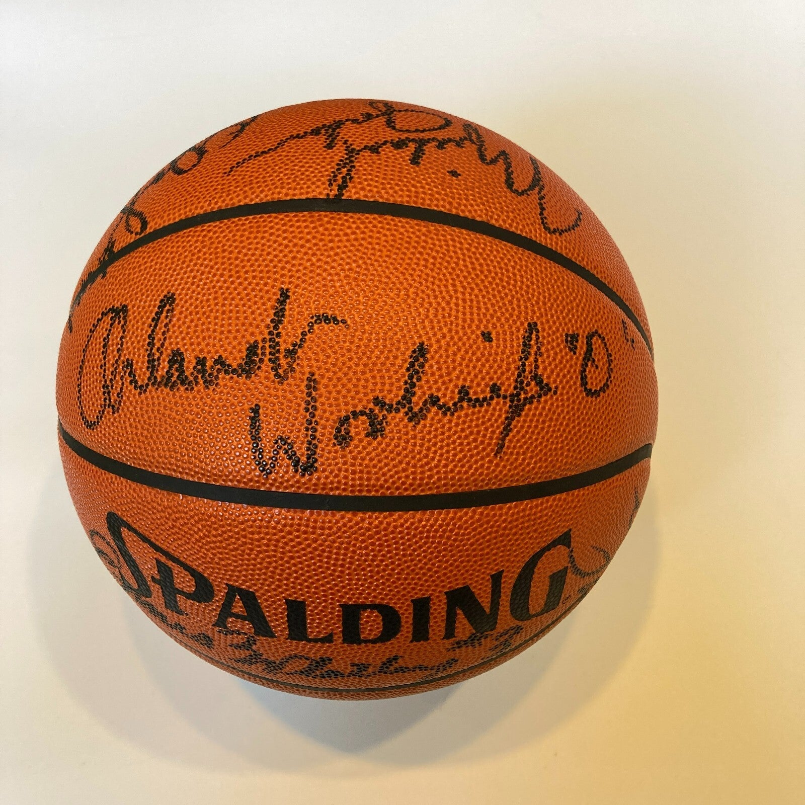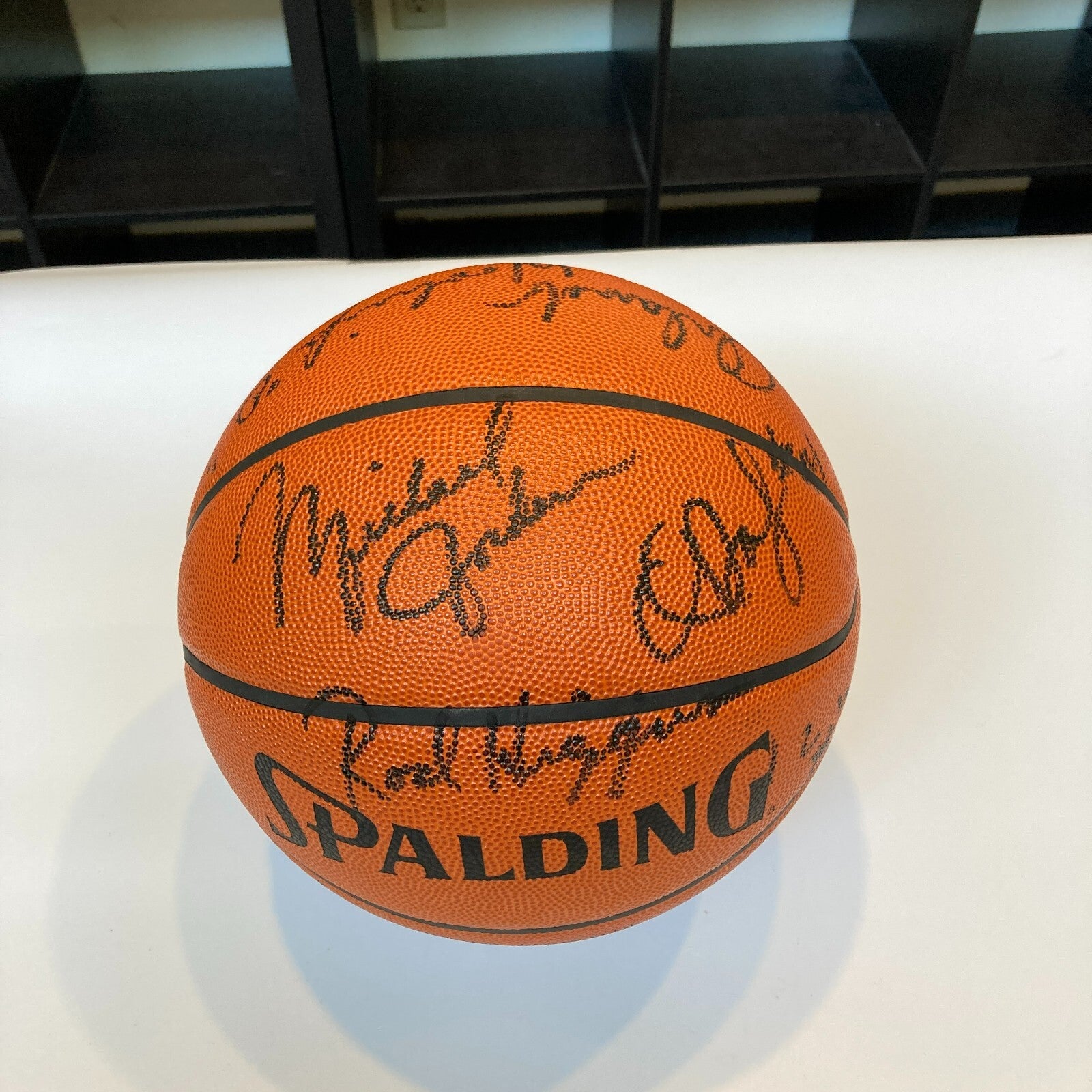This Spalding Official Game Ball has been signed by 11 members of the 1984-85 Chicago Bulls. The signatures are highlighted by a rookie Michael Jordan, Quintin Dailey, Rod Higgins, Steve Johnson, Dave Corzine, Jawann Oldham, Wes Matthews, Sidney Green Caldwell Jones, Ennis Whatley and Orlando Woolridge. The signatures are done in black marker and have been graded by Beckett a MINT 9. Accompanied by a Beckett LOA.