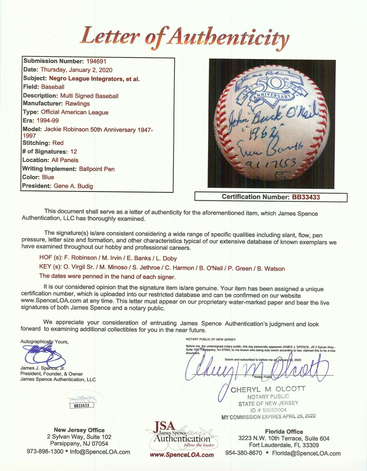 Official American League Jackie Robinson 50th Anniversary baseball is signed by 12 Negro League Integrators, with Larry Doby on the sweet spot. Other signatures include: Frank Robinson, Ernie Banks, Monte Irvin, Minnie Minoso, Sam Jethroe, Buck O'Neil and more, with each player adding an inscription under their signature. Each blue ballpoint pen signature is authenticated by JSA with a full LOA.