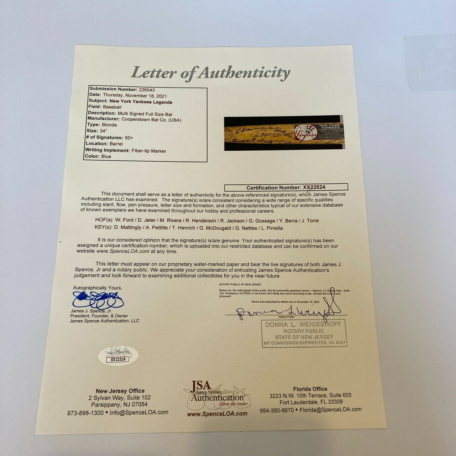 The New York Yankees are easily the most storied franchise in MLB history having won 27 World Series titles and 40 American League Pennants and are arguably the most successful professional sports teams in the United States. This presented Cooperstown Autograph Model bat is signed by over 50 former New York Yankees players. The bat features key signatures from Hall of Famers Whitey Ford, Derek Jeter, Mariano Rivera, Rickey Henderson, Reggie Jackson, Goose Gossage, Yogi Berra, and Joe Torre. Other key signatures on the bat include Don Mattingly, Andy Pettite, Lou Piniella, Greg Nettles, Tommy Henrich, and Gil McDougald. The signatures on the bat were signed with a blue marker. The Cooperstown Autograph Model bat signed by over 50 New York Yankees legends comes with an LOA from JSA (XX22524) for the signatures.