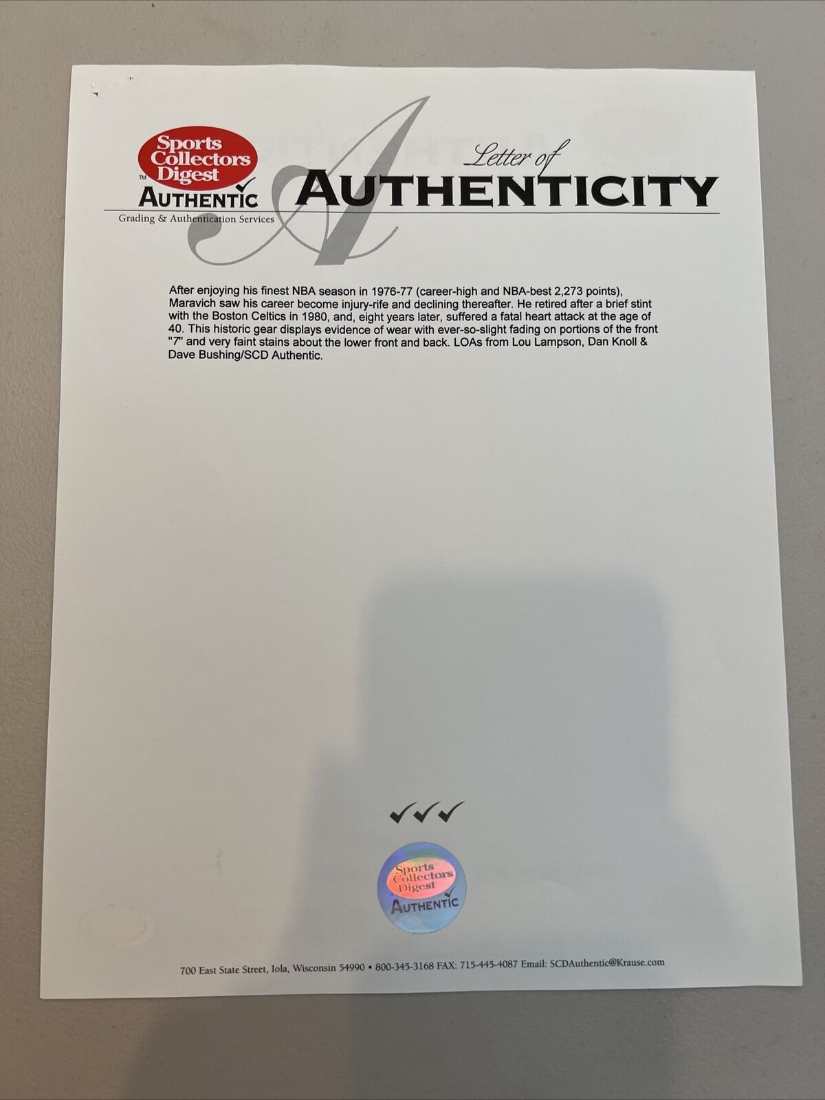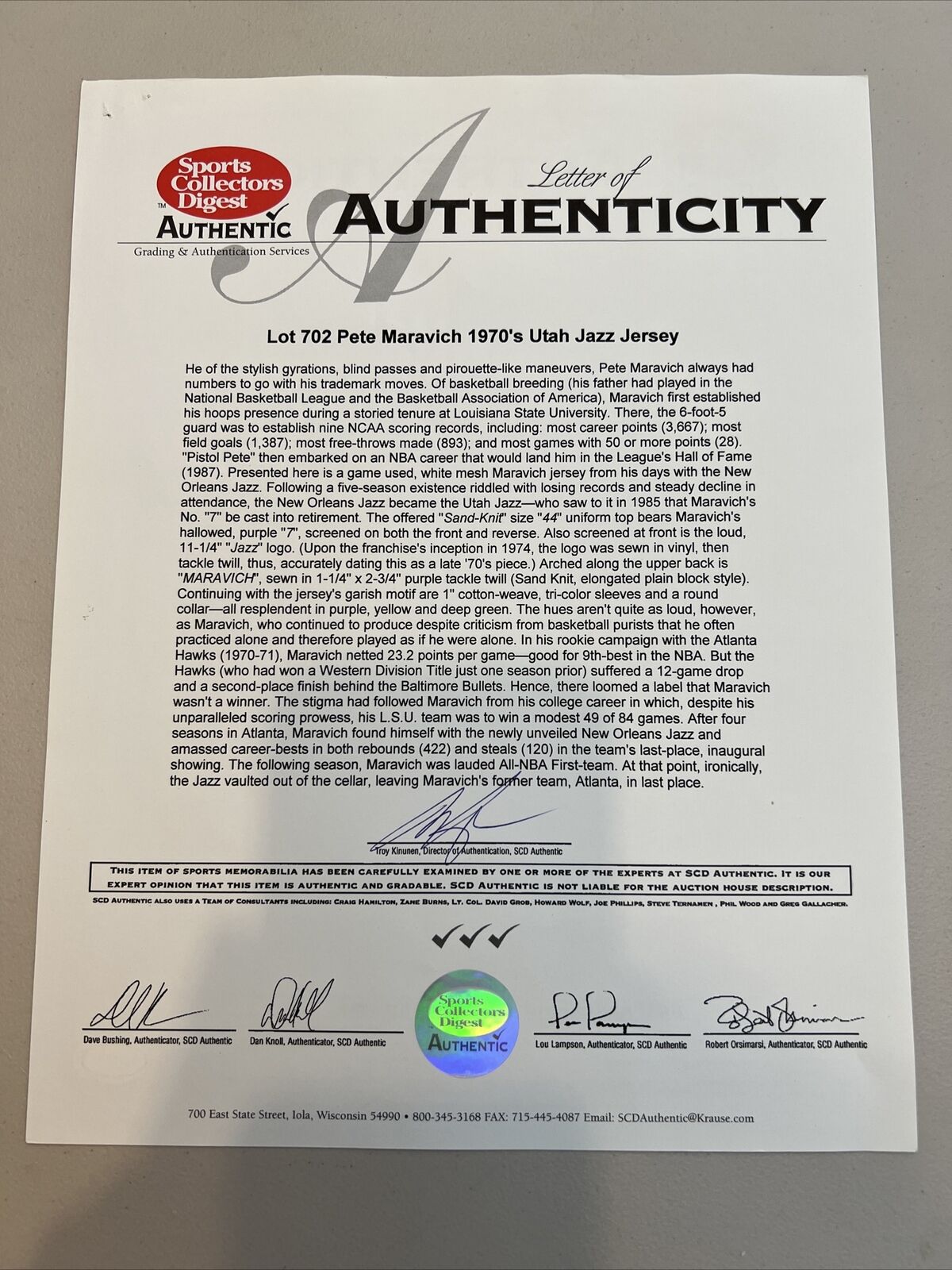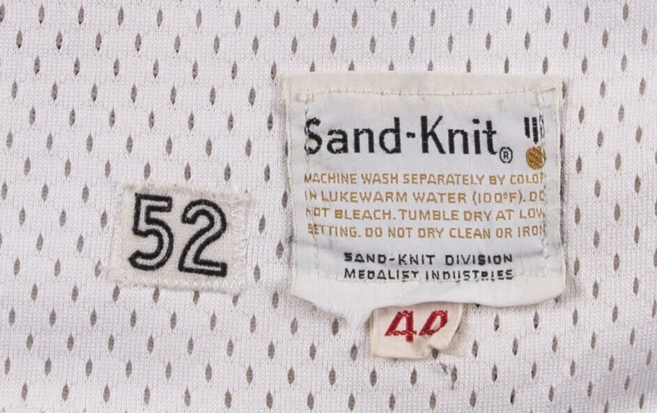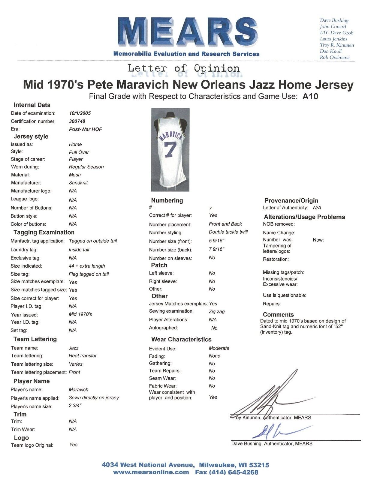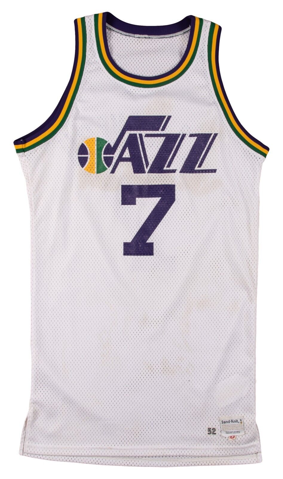 This offered white home New Orleans Jazz jersey dates to the mid-1970s, before the franchise transferred to Utah, and was worn by Maravich during this time frame. This size 44 Medalist Sand-Knit mesh jersey features "JAZZ" screen-printed on the front in purple, with green and yellow accents on the ball of the logo. Maravich's number "7" is screen-printed on the front and back, and "MARAVICH" is sewn on the back above his number in purple tackle twill. The jersey has been dated to the mid-1970s by the game experts at MEARS based on the Sand-Knit tag with a "44" flag and the numeric font of "52", which is the additional inventory patch sewn next to the Sand-Knit tag. Both the tag and the patch are sewn onto the front left tail. The open sleeves and rounded collar have a green, yellow, and purple pattern on a ribbed material. This jersey shows nice game use with some light stains and comes with a full LOA from MEARS (300748), who has given this Pete Maravich game-used jersey its highest possible grade of A10.