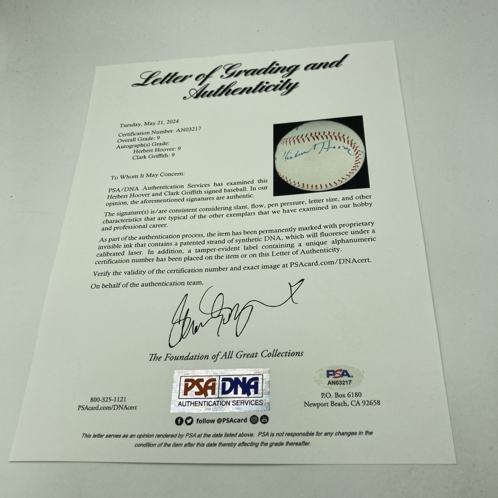 Beautiful baseball signed in bold blue ink, on separate side panels, by President Herbert Hoover, thirty-first president of the United States and Hall of Famer Clark Griffith. Both signatures are Graded MINT 9 by PSA/DNA with an overall grade of 9. Clark Griffith enjoyed a lifetime in baseball, first as a star pitcher, then as a manager, and finally as owner of the Washington Senators, where he rose to prominence as one of the most influential figures in the game. Griffith was elected to the Hall of Fame in 1946, and he passed away nine years later in 1955. President Hoover, who played shortstop during his youth, was a great fan of our national pastime and once remarked that "baseball is the greatest of American sports." The record shows that Hoover attended nine major league games during his presidency, including four consecutive season openers in Washington where he threw out the ceremonial first pitch and three World Series games (1929, 1930, and 1931). This is an exceptional Presidential signed baseball and one that would appeal to even the most discriminating collector. Extraordinary in all respects! Full LOA from PSA/DNA.
