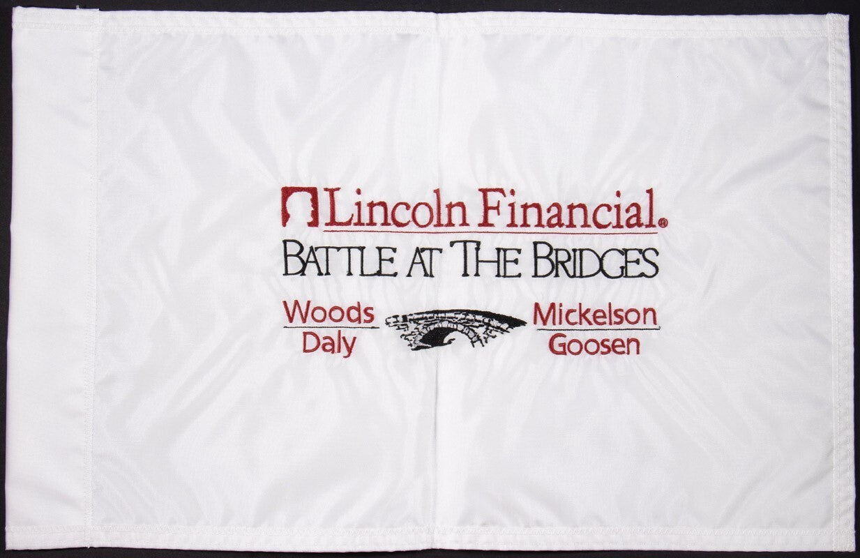 In the final round of the Battle at the Bridges on July 25, 2005, Tiger Woods and John Daly went head-to-head against Phil Mickelson and Retief Goosen in Rancho Santa Fe, CA. As the tournament drew to a close, Retief Goosen birdied four of the last six holes, leading his team to a 5 & 3 victory over Woods and Daly. Lincoln Financial, the tournament's proud sponsor, is prominently featured beneath a striking Tiger Woods autograph. Regarded as one of the greatest golfers of all time and a sports icon, Woods's signature adds immense value to this piece. A PSA/DNA sticker is affixed in the bottom left corner, and an LOA is included for authenticity.