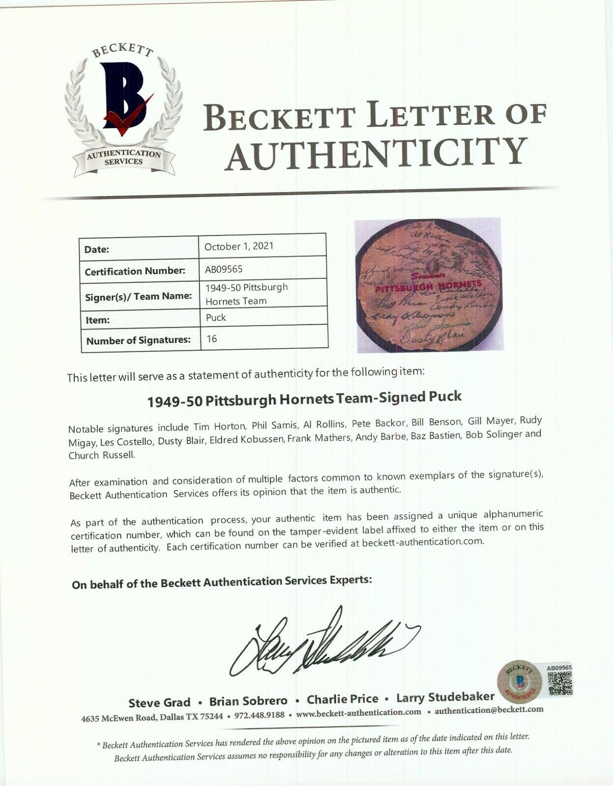 This Pittsburgh Hornets hockey puck is signed by 16 members of the team, including Tim Horton. Other signatures include: Phil Samis, Al Rollins, Pete Backor, Bill Benson, Gill Mayer, Rudy Migay, Les Costello, Dusty Blair, Eldred Kobussen, Frank Mathers, Andy Barbe, Baz Bastien, Bob Solinger and Church Russell. Full LOA from Beckett