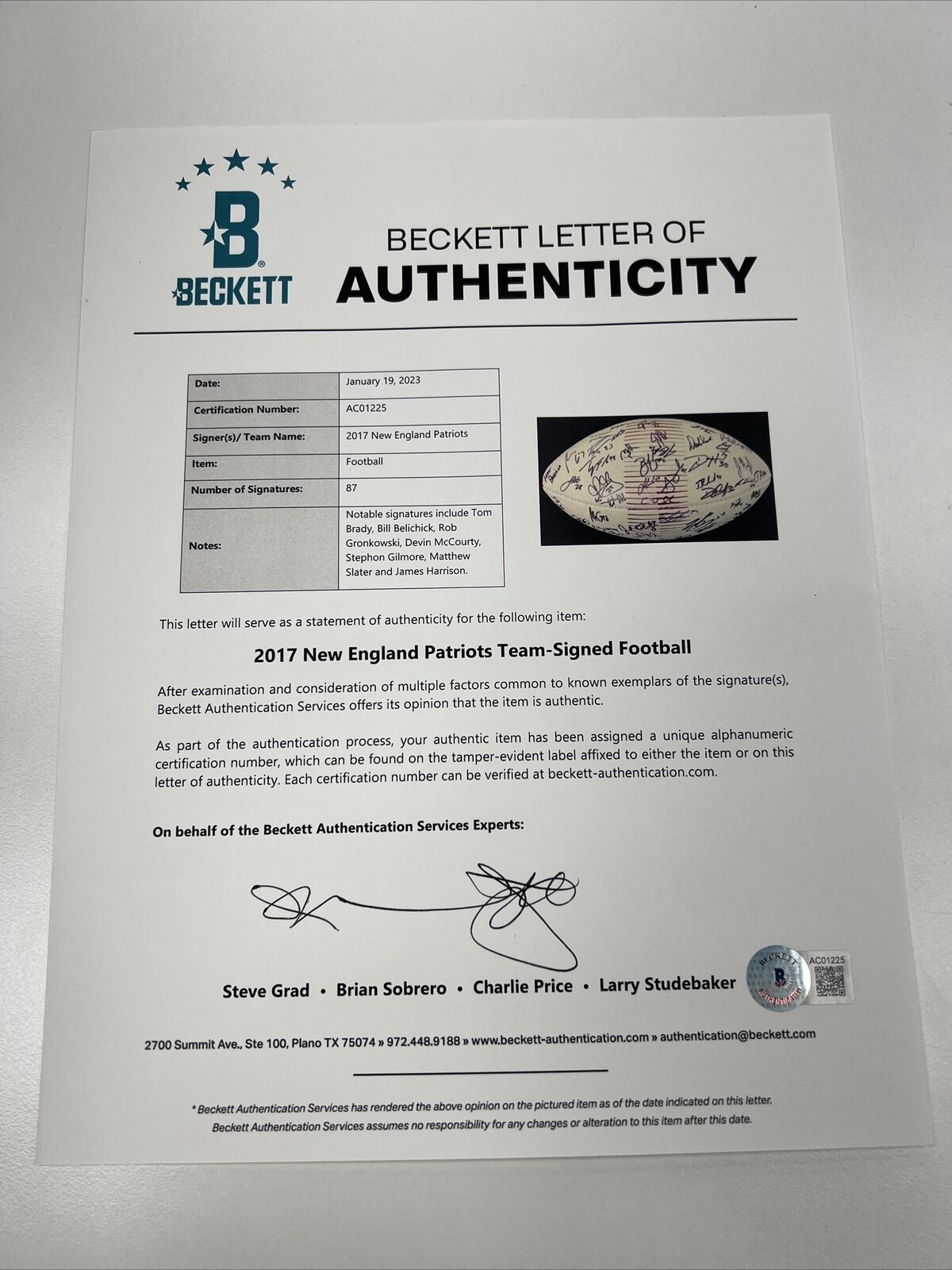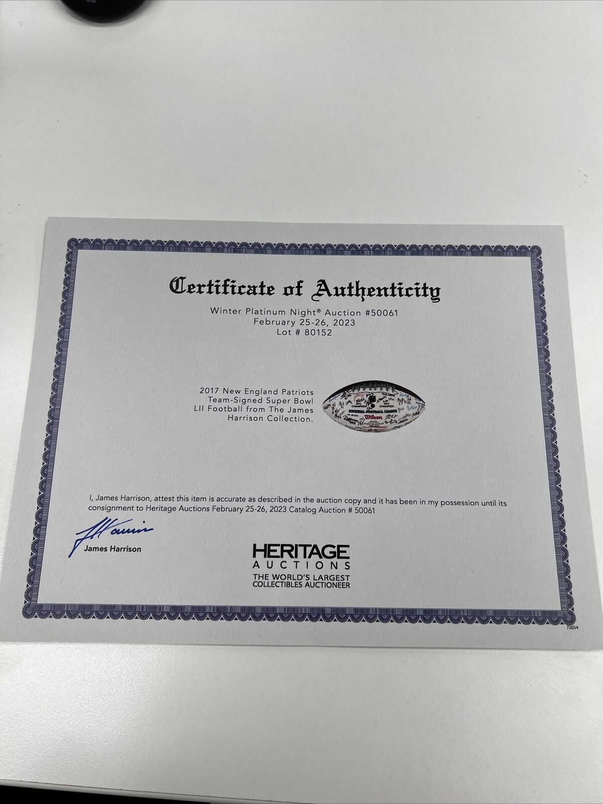 2017 New England Patriots Team-Signed Super Bowl LII Football from The James Harrison Collection. Consigned directly from Steelers legend James Harrison, this white panel Super Bowl LII football features signatures from the 2017 AFC champion New England Patriots. Signatures include: Tom Brady, Bill Belichick, Rob Gronkowski, Danny Amendola and many others. Letter of provenance from James Harrison. Full LOA from Beckett Authentication Services.