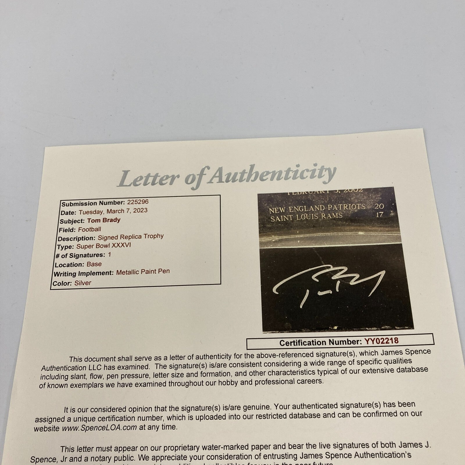 Presented here is a 2002 Super Bowl XXXVI Trophy signed by Tom Brady. The award measures approximately 18” Tall. The trophy is signed in silver maker on the black base.