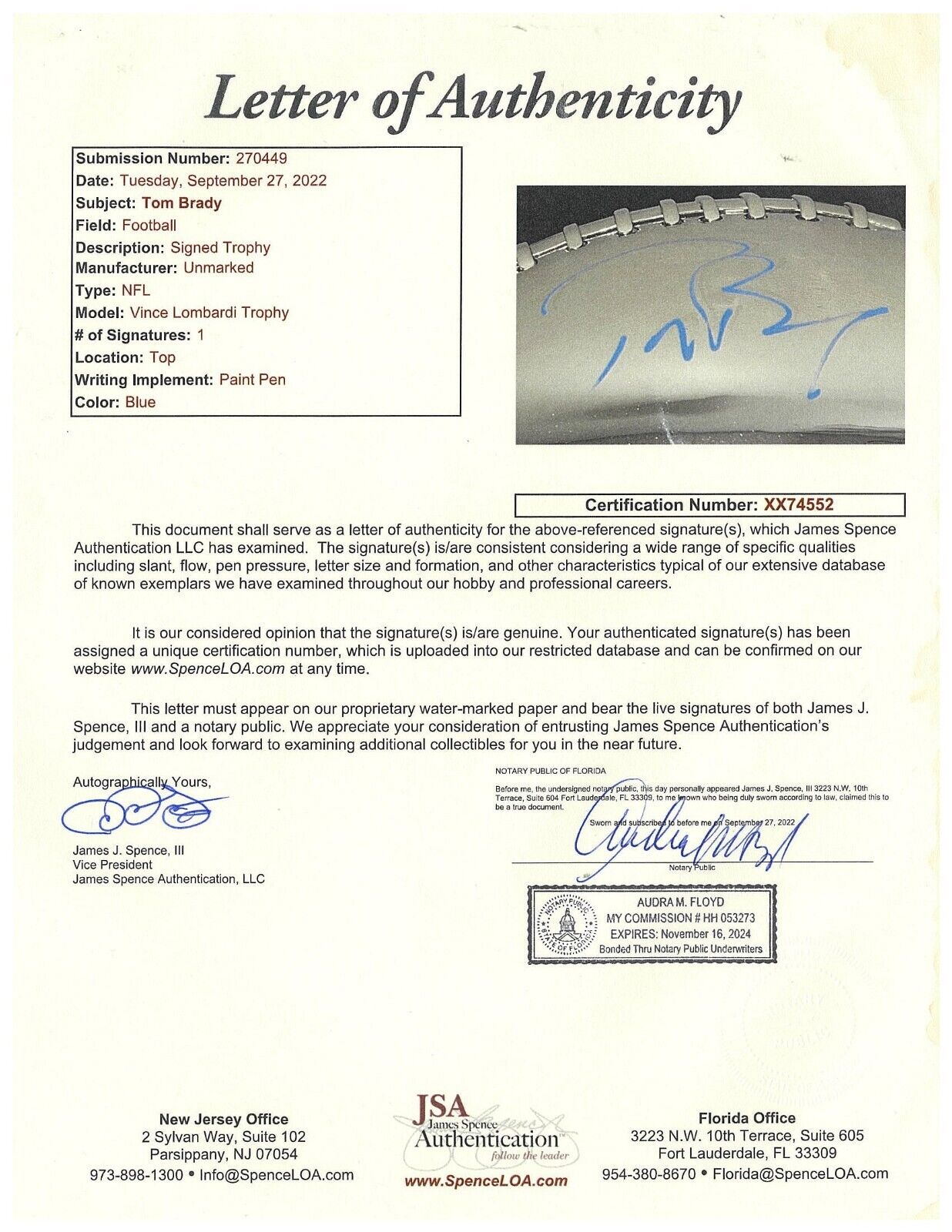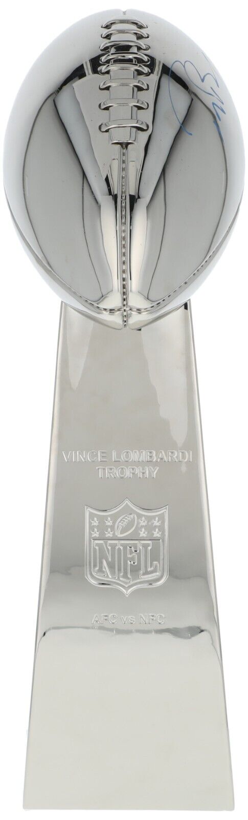 Measuring 21 inches, this replica Vince Lombardi Trophy features "Vince Lombardi Trophy," the NFL Equipment shield, and "AFC vs NFC" etched across the front. Brady placed a flowing blue paint pen signature on the right side of the football atop the trophy. Accompanied by an LOA from JSA for Brady's signature.
