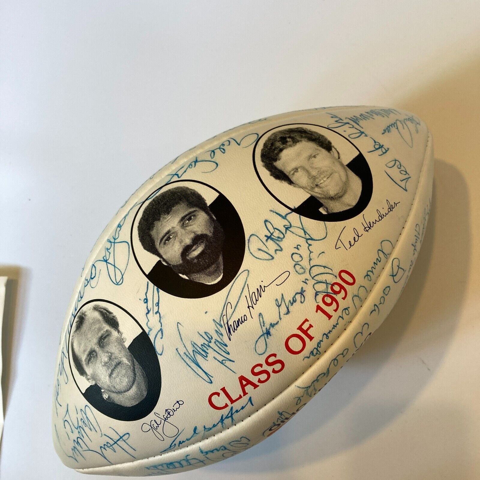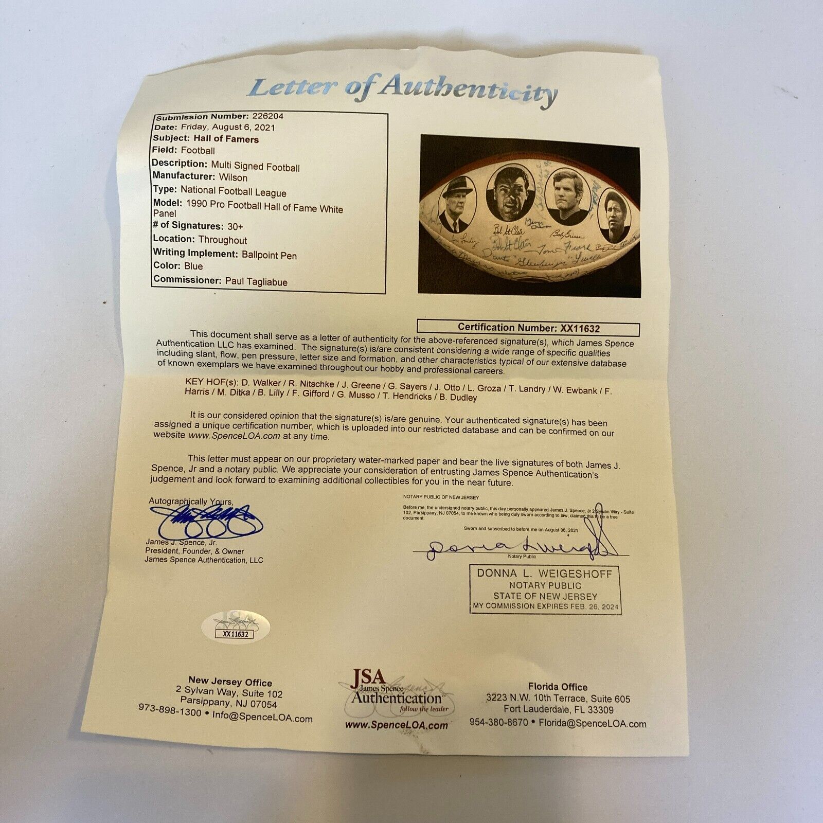 Fine football has images of classic HOFers. A Pro Football HOF model ball, the autographs are neatly signed and contrast perfectly against the clean ball. The 30+ autographs include Tom Landry, Ray Nitschke, Greene, Groza, Ditka, Harris, Gifford, Dudley, Sayers, Buchanan, Griese, Lilly, Warfield and Doak Walker.