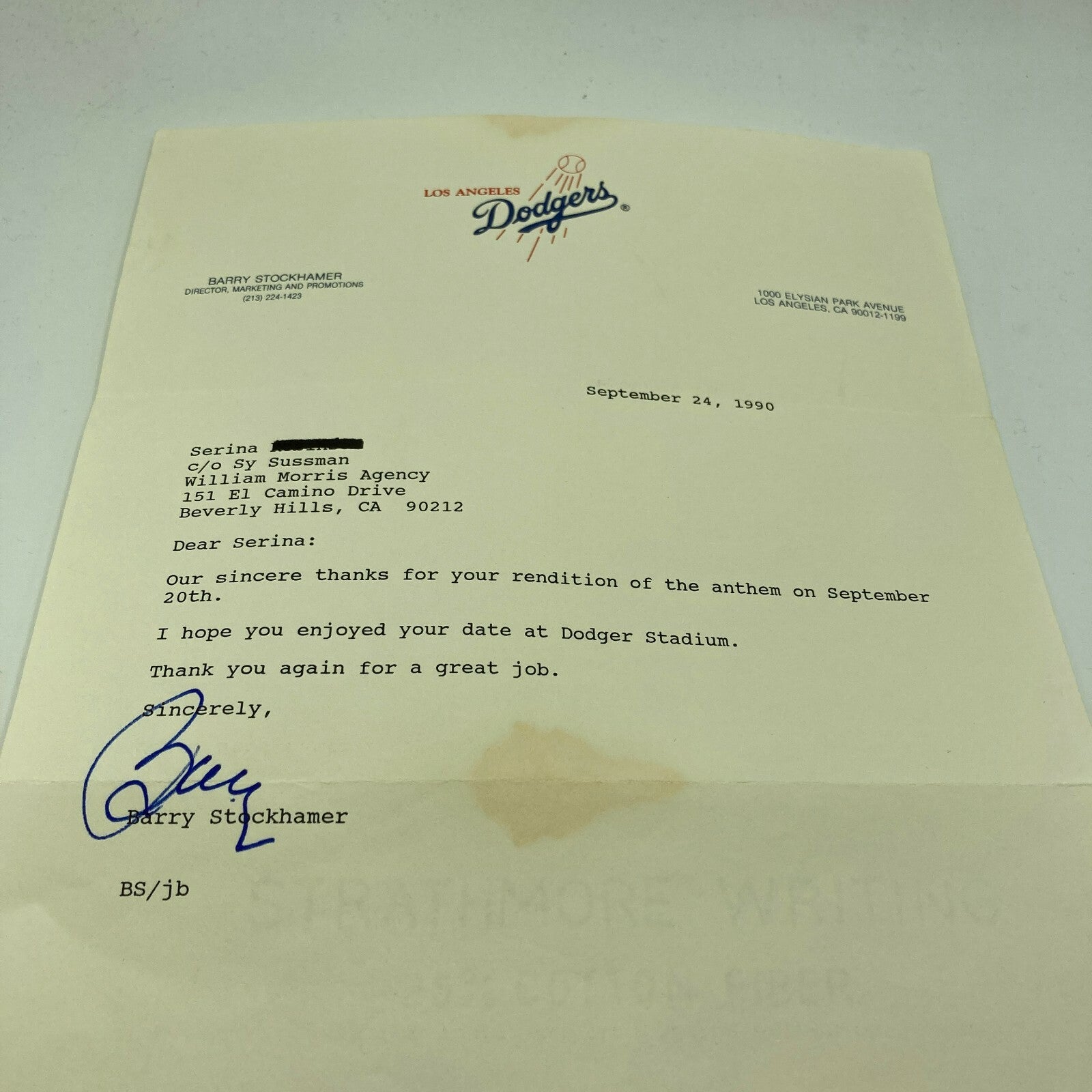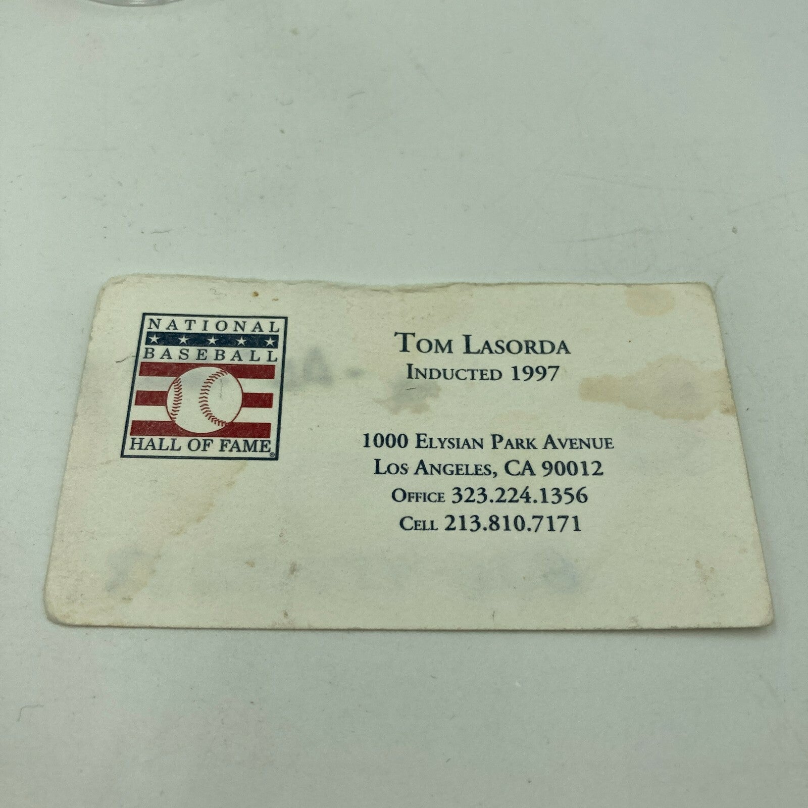 Very rare Tommy Lasorda Signed game used National League baseball and signed photo given by the Dodgers to a girl who sang the National Anthem at Dodger Stadium in 1990. Comes with original letter from the Dodgers and Tommy Lasorda personal business card with his cell.