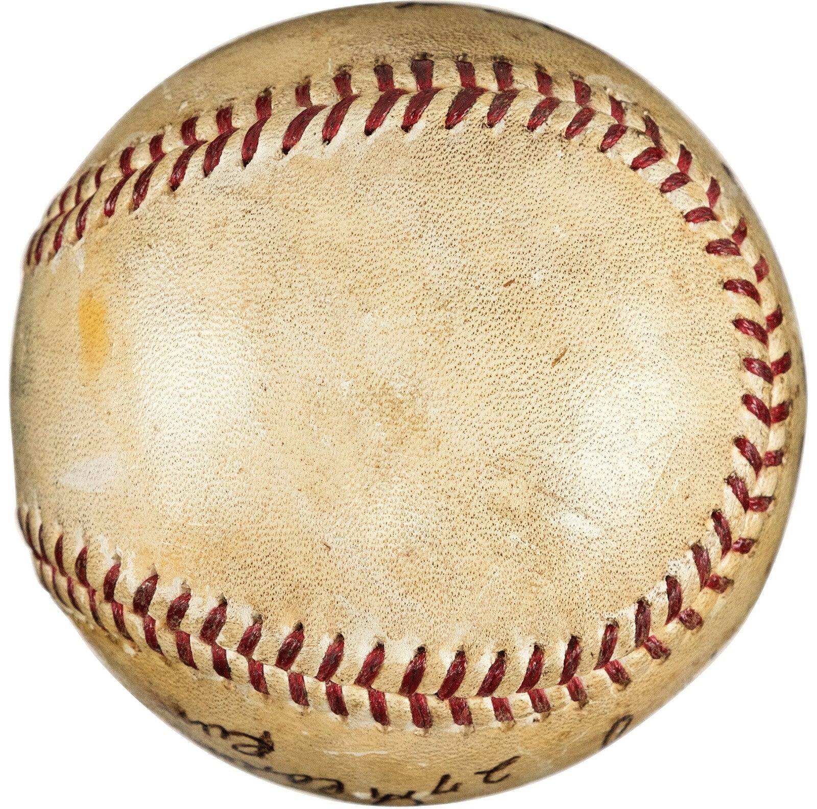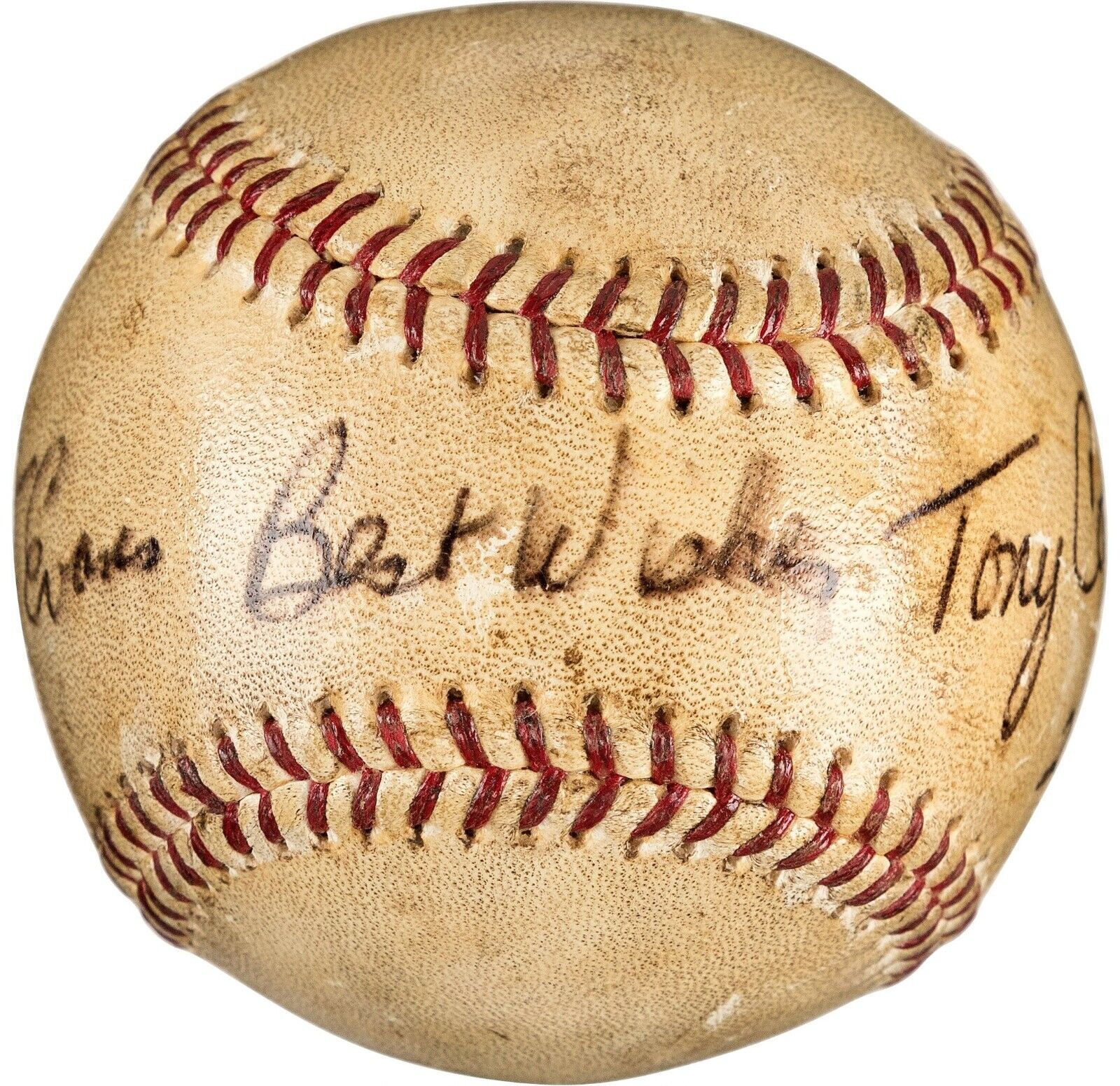 Tony C still holds the record for most homers by a teenager, youngest player to take the home run crown and youngest player to reach the A.L. 100-home run plateau. On April 27, 1965, Conigliaro hit the ball presented here for his twenty-seventh career home run off White Sox hurler John Buzhardt at Comiskey Park. Official American League (Cronin) sphere is inscribed and signed "To Evans Best Wishes Tony Conigliaro 27th Career Home Run" in vintage black ink. LOA from Heritage Auctions. Full LOA from Beckett Authentication Services.