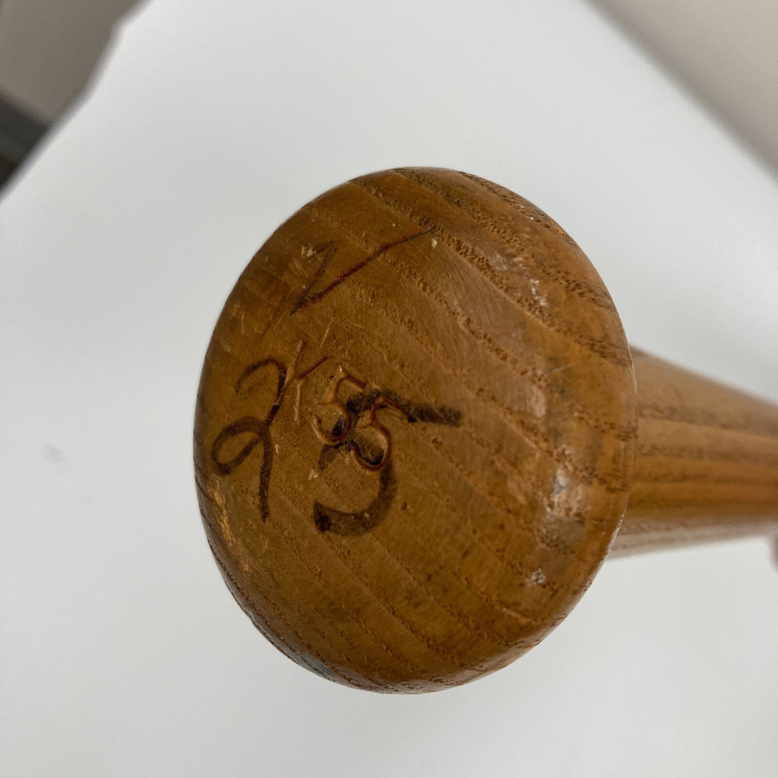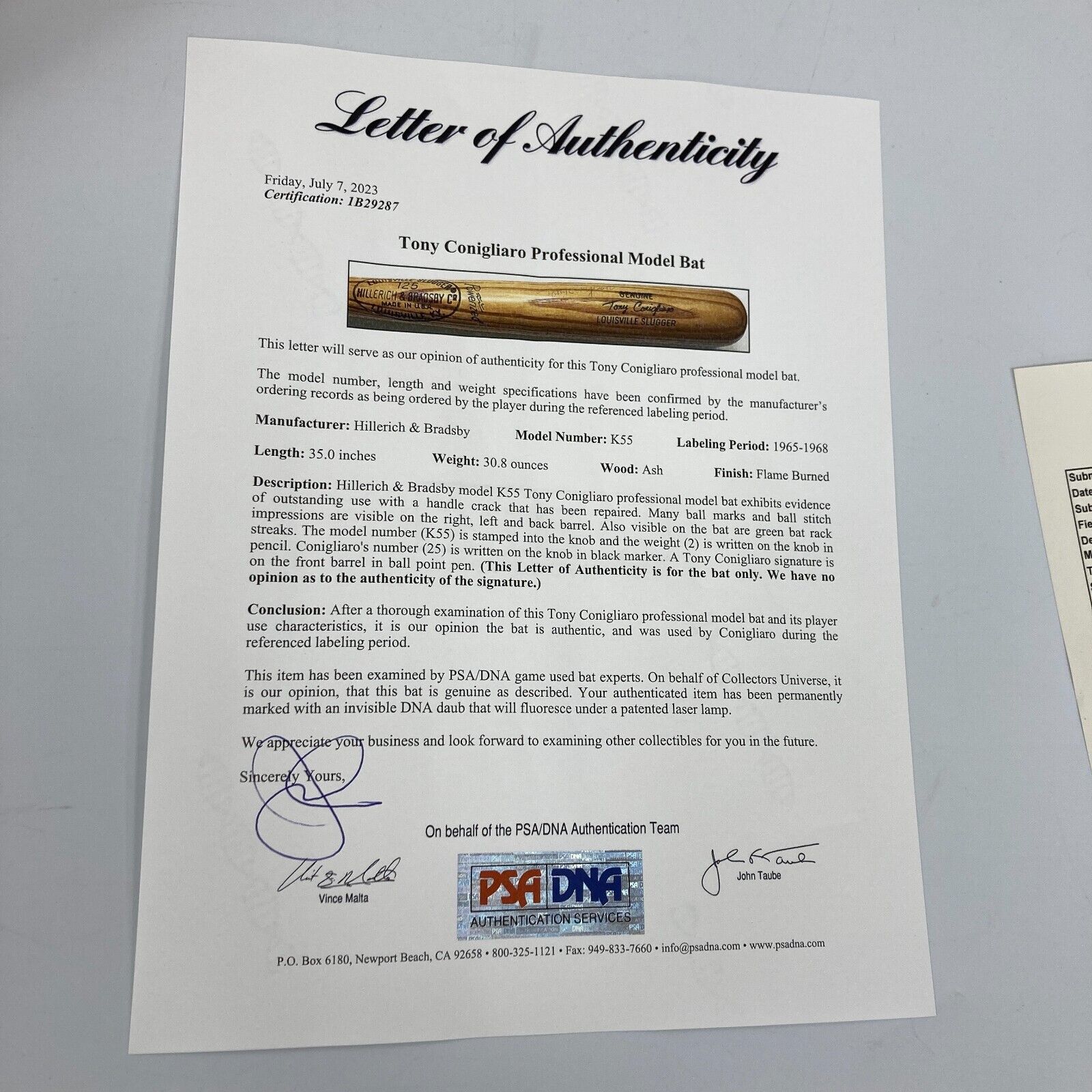 Tony Conigliaro H&B signature-model ("K55") bat dating from the 1965-1968 manufacturing period. The bat displays outstanding use, including ball and stitch marks on all sides of the barrel, green rack streaks, cleat marks, and a slight handle crack (which has been repaired). Conigliaro's uniform number ("25") is written in black marker on the knob end. The bat's model number "K55" is stamped into the knob, along with the weight ("2") written in pencil. Conigliaro has signed the bat in blue ink on the barrel. Conigliaro led the American League in home runs in 1965, which was his second season in the Majors. Unfortunately, his promising career was cut short due to a horrific beaning he suffered in 1967. Length: 35 inches. Weight: 30.8 ounces. Full LOA from John Taube of PSA/DNA.