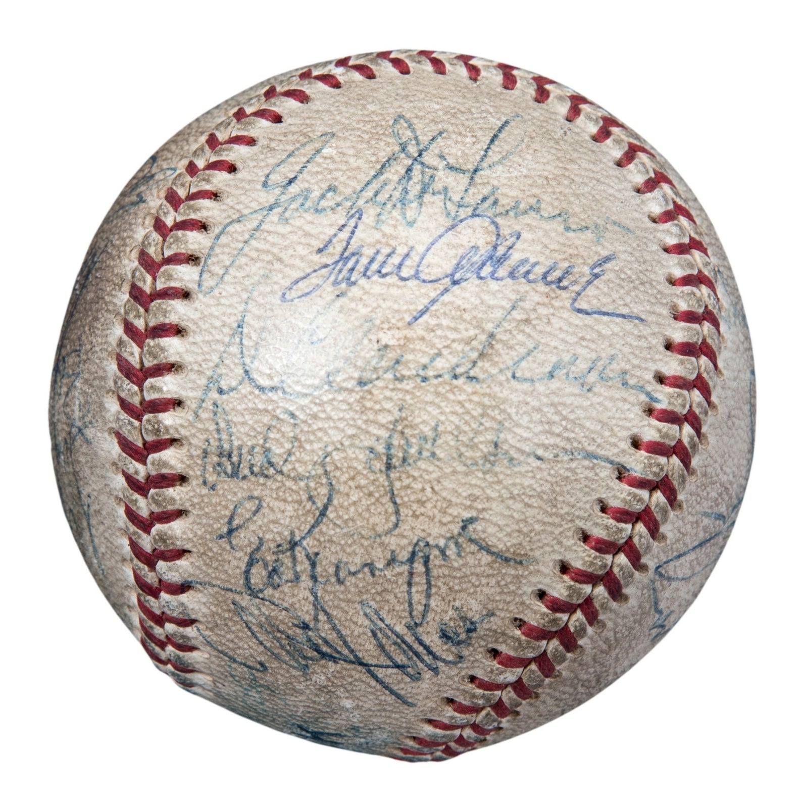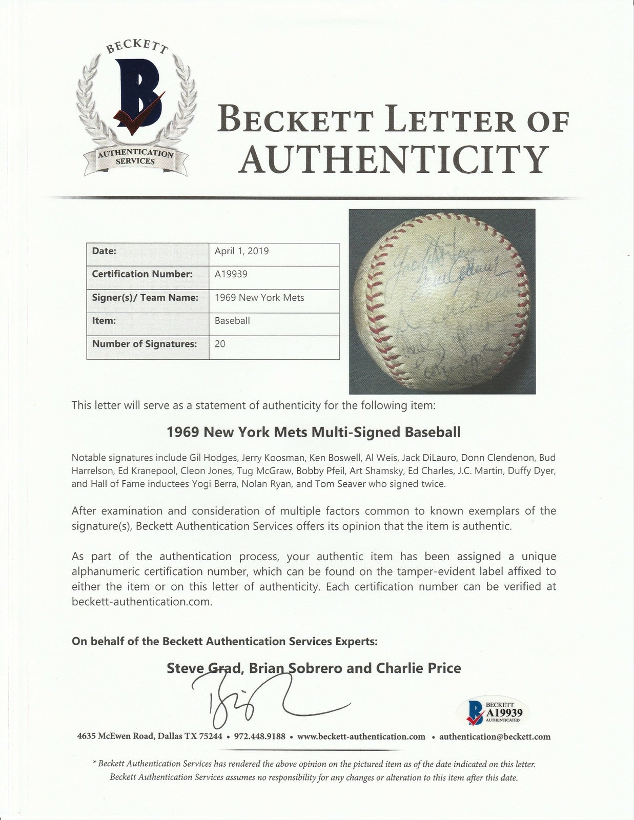 Offered here is a baseball signed by 20 members of the 1969 “Miracle Mets”. The 1969 Mets turned in the franchise’s first ever winning year, going 100-62 in the regular season, before unseating the Atlanta Braves in the inaugural National League Championship Series and the favored Baltimore Orioles in the 1969 Fall Classic. The legendary Gil Hodges has signed the sweet spot of this ball, while other signatures include the Hall of Famers Nolan Ryan, Yogi Berra, and Tom Seaver. The remaining signatures include Tug McGraw, Ed Charles, Art Shamsky, Duffy Dyer, JC Martin, Rod Gaspar, Jerry Koosman, Ken Boswell, 1969 World Series MVP Al Weis, Jack DiLauro, Bud Harrelson, Bobby Pfeil, and several others. The signatures have been written in blue pen. “1969 New York Mets” is written on the opposite panel to the sweet spot in blue pen. This baseball comes with a LOA from Steve Grad of Beckett Authentication (A19939).