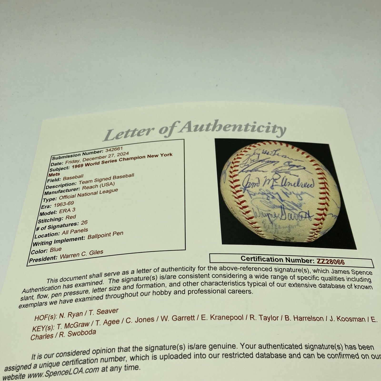 1969 New York Mets team signed baseball - World Series Champions. Spalding W.Giles Official National League baseball has been signed by (26) including Nolan Ryan, Tom Seaver, Tug McGraw, Jerry Koosman, Ron Swoboda, Tommie Agee, Ed Kranepool, Jack DiLauro, Cal Koonce, and others.