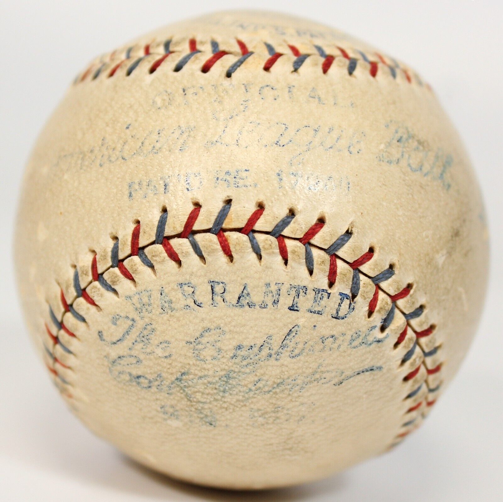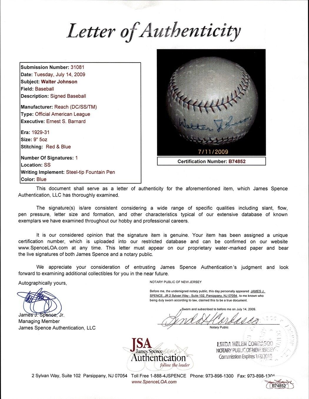 Reach Official American League (Barnard) baseball, dating to 1929-31, signed in steel tip fountain pen by the "Big Train." Largely clean with some minor surface abrasions here and there, the baseball has been well-preserved. The signature was applied in dark blue ink.