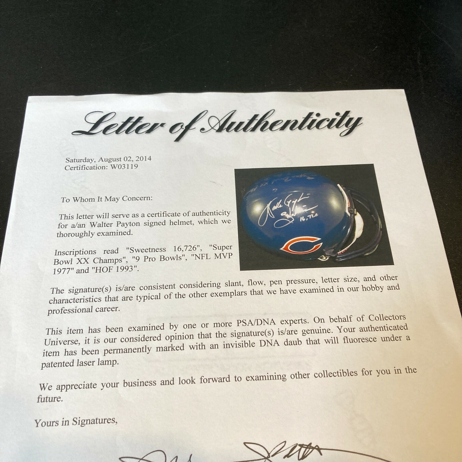 Sweeten your collection with this Walter Payton signed helmet. This collecting confection is a full size Riddell Chicago Bears helmet in like-new condition, with a pleasing silver felt-tip pen autograph and an extensive array of inscriptions, with "Sweetness; 16,726; Super Bowl XX Champs; 9 Pro Bowls; NFL MVP 1977; and HOF 1993". These neatly applied scriptings cover both the left and right side of the helmet, making for spectacular display. Full photo LOA from PSA/DNA.