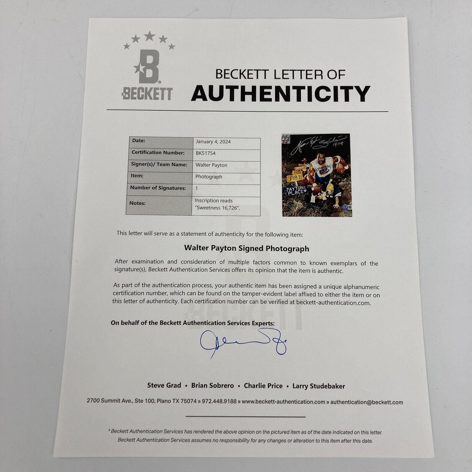Walter Payton "Sweetness 16,726 Yards" Signed Inscribed 8x10 Photo Beckett COA
