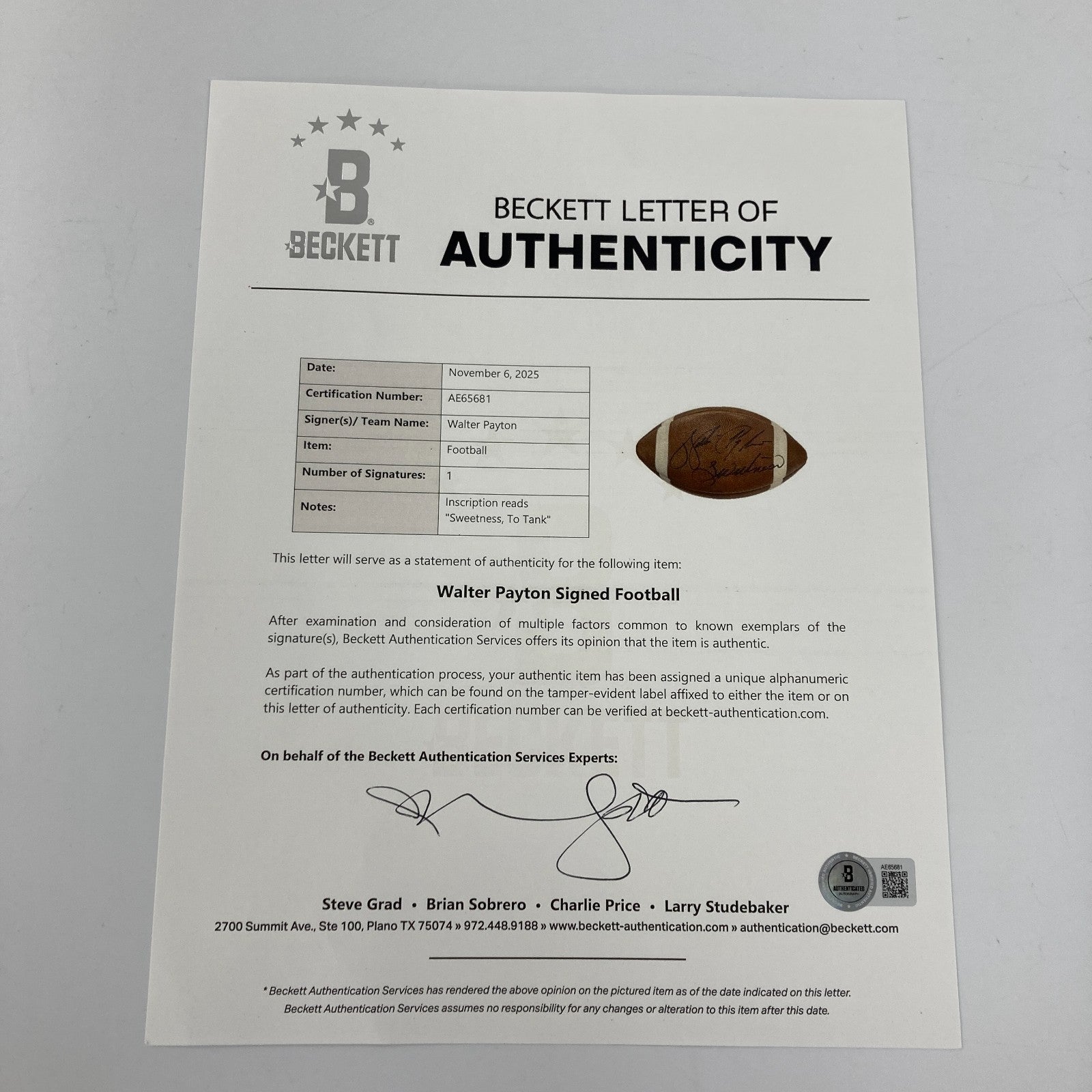 1980's Walter Payton "Sweetness" Signed Football. Presented is a vintage Wilson football signed, inscribed and by Walter Payton. Signed with a "Sweetness" inscription in bold black ink. Full LOA from PSA/DNA. Full LOA from Beckett Authentication Services.