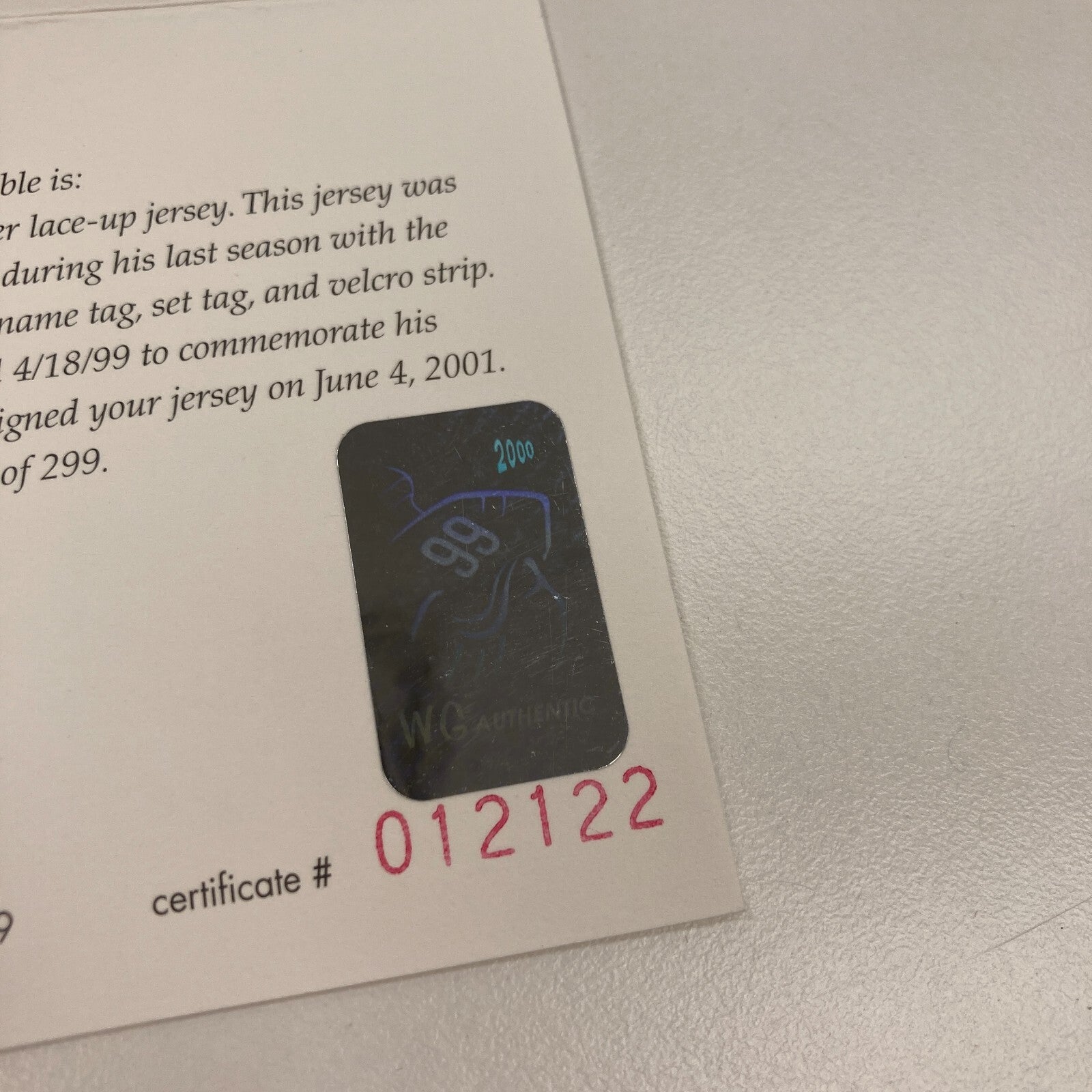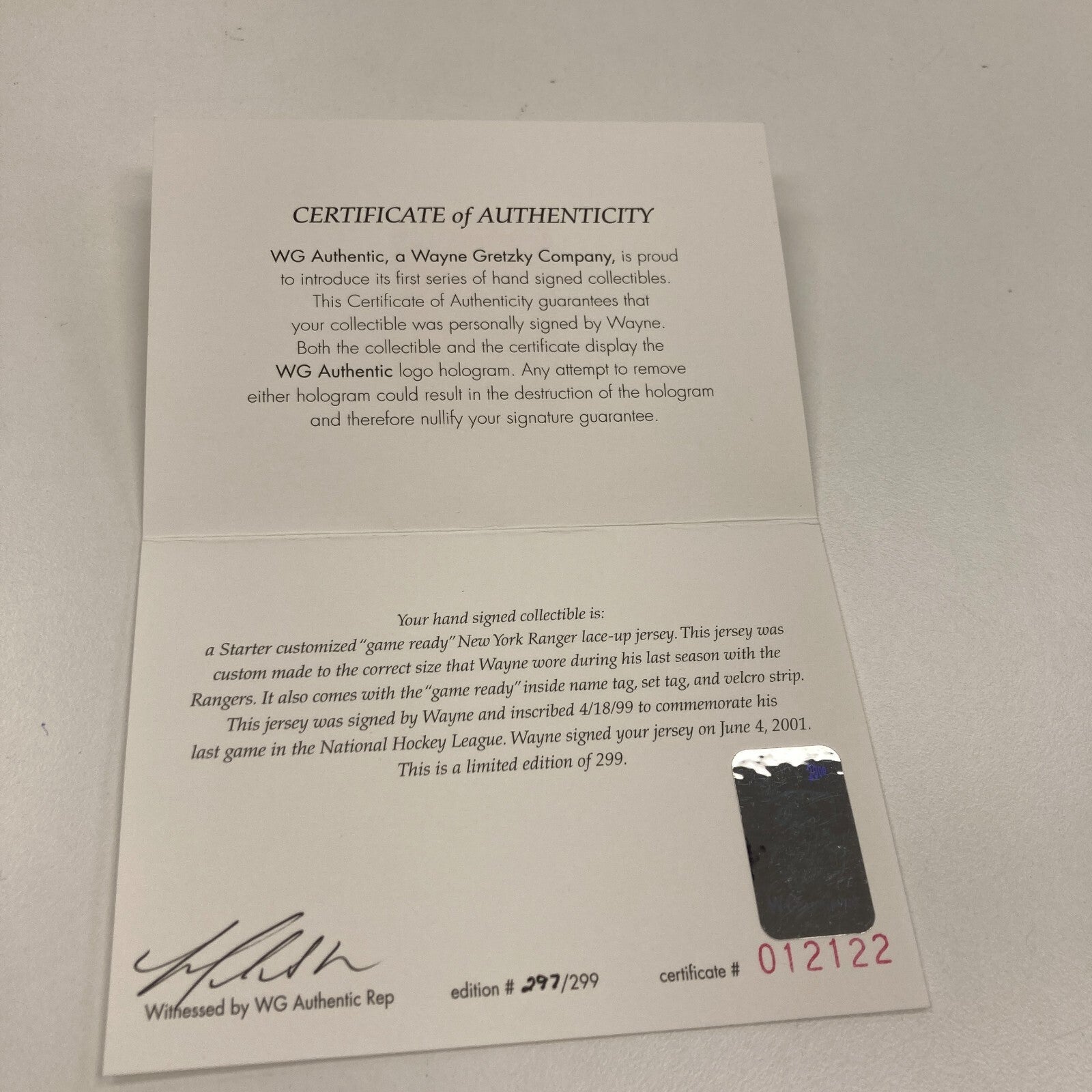 Presented is a 1998-99 styled New York Rangers home starter jersey signed by the greatest hockey player in the history of the sport, Wayne Gretzky. Gretzky has penned his flowing signature in black marker on the first "9" of his league-wide retired number "99." Gretzky's tenure with the Rangers was a brief one, spending the final three years of his career with the Original Six franchise before announcing his retirement. The jersey comes with an LOA from WGA, plus a STICKER ONLY from JSA (Y78626) and PSA/DNA (002091) for signature.