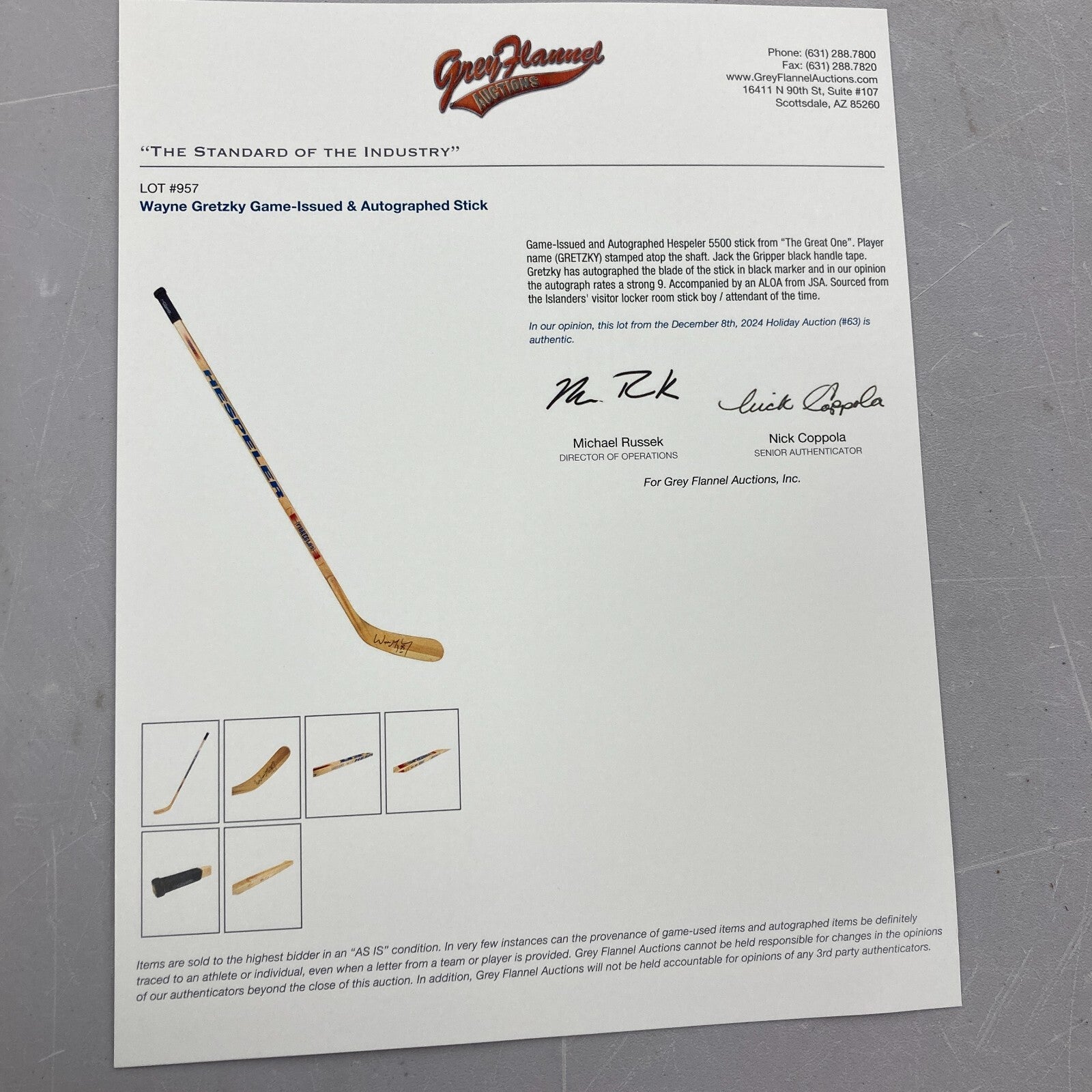 Game-Issued and Autographed Hespeler 5500 stick from “The Great One”. Player name (GRETZKY) stamped atop the shaft. Jack the Gripper black handle tape. Gretzky has autographed the blade of the stick in black marker. Comes with full letter JSA COA and COA from Grey Flannel.