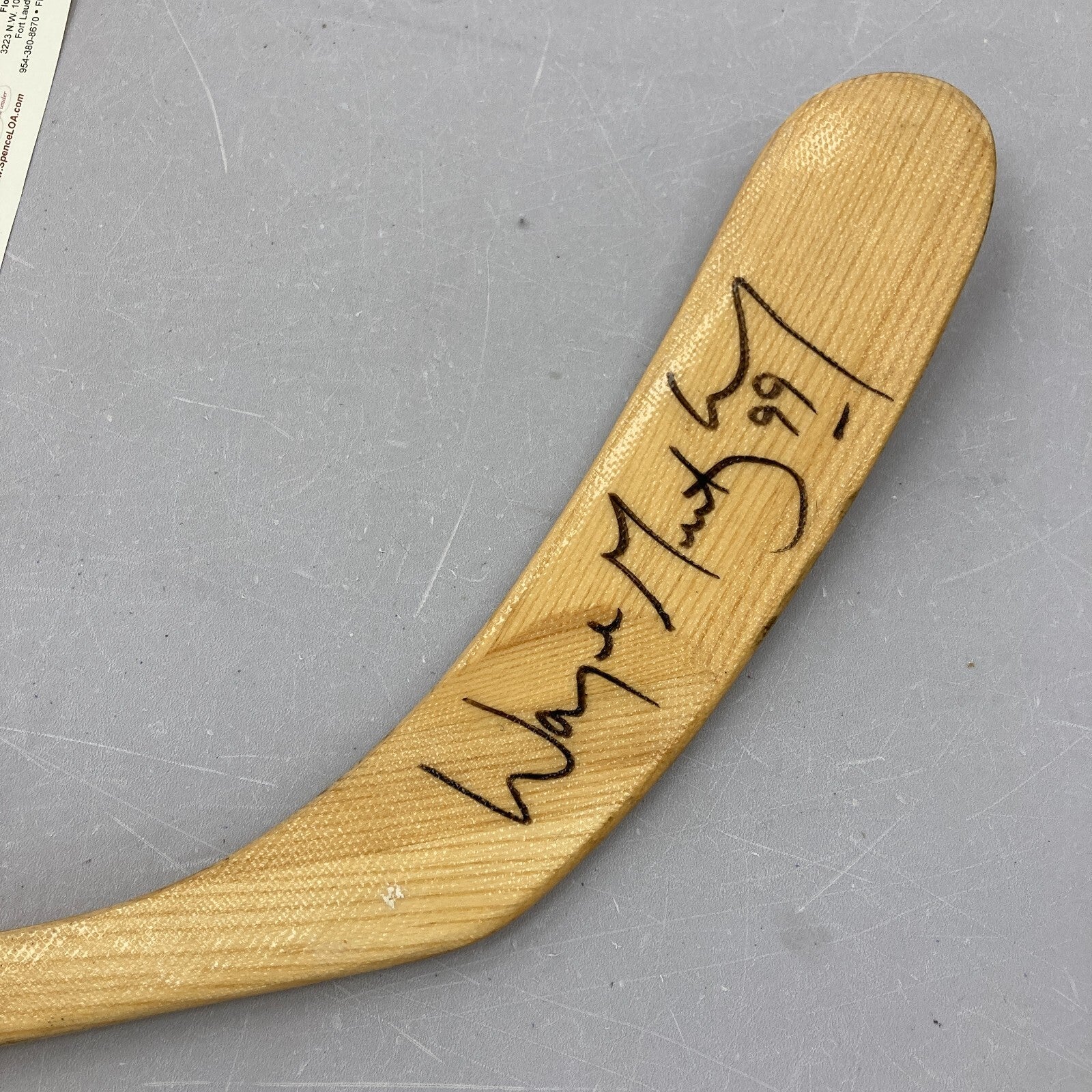 Hespeler stick is unused and untaped, signed by hockey's GOAT, Wayne Gretzky. Model 5500 is for a left-handed shot with Gretzky stamped in black on the shaft. The Great One has signed his name along with his number 99 on the untaped blade in bold Sharpie.