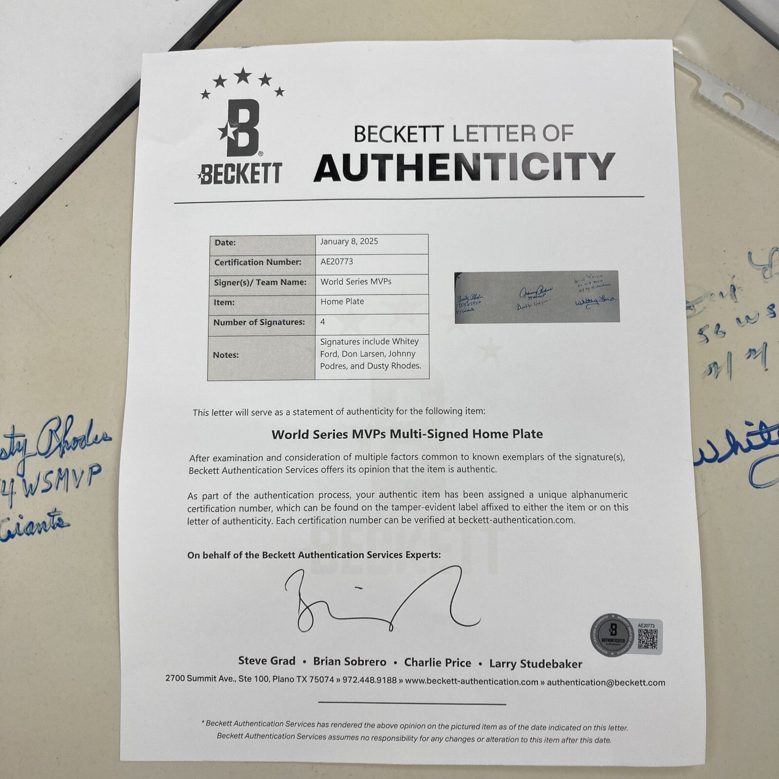 Presented is a home plate signed by baseball legends, Whitey Ford, Don Larsen, Dusty Rhodes and Johnny Podres. These Dodgers and Yankees stars have penned their flowing signatures in blue ink, along with team and WS MVP inscriptions across the plate. The item comes with an LOA from Beckett for signature.