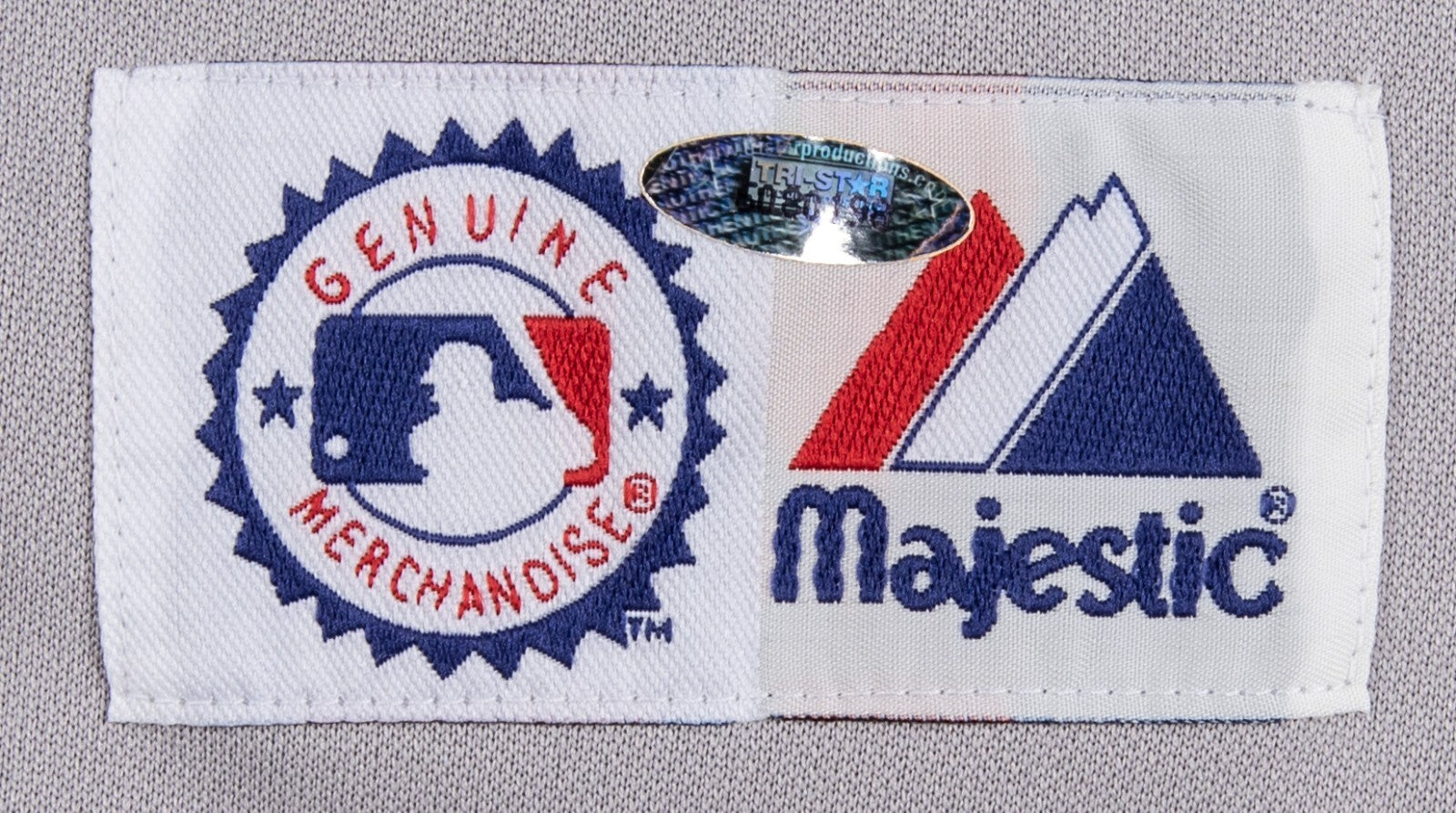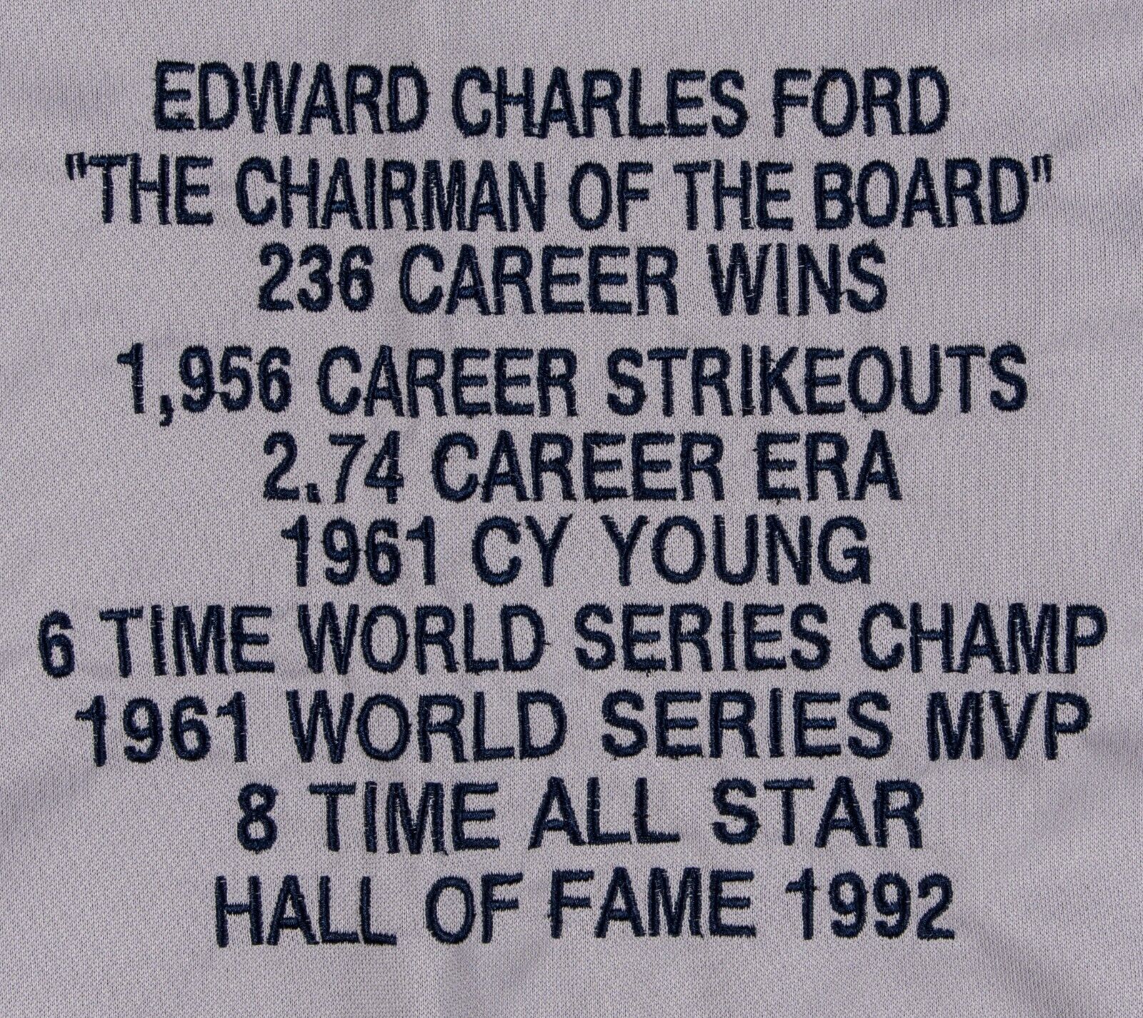 Presented is a New York Yankees embroidered stat road jersey signed by New York Yankees icon and Hall of Fame southpaw Whitey Ford. Ford has penned his flowing signature in black marker on the left chest of the jersey. The lower right front of the jersey features Ford's career statistics and achievements—from both the postseason and the regular season—embroidered in black numbering and lettering. The jersey comes with a sticker from Tristar (6080198) for signature.