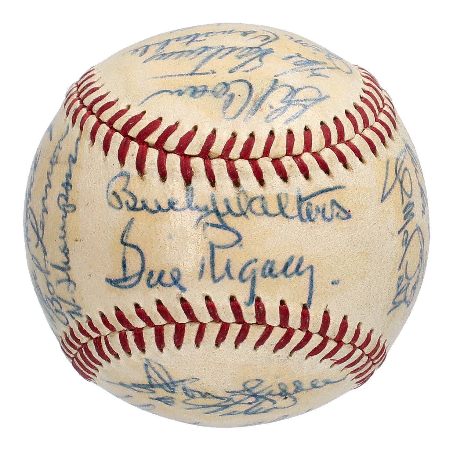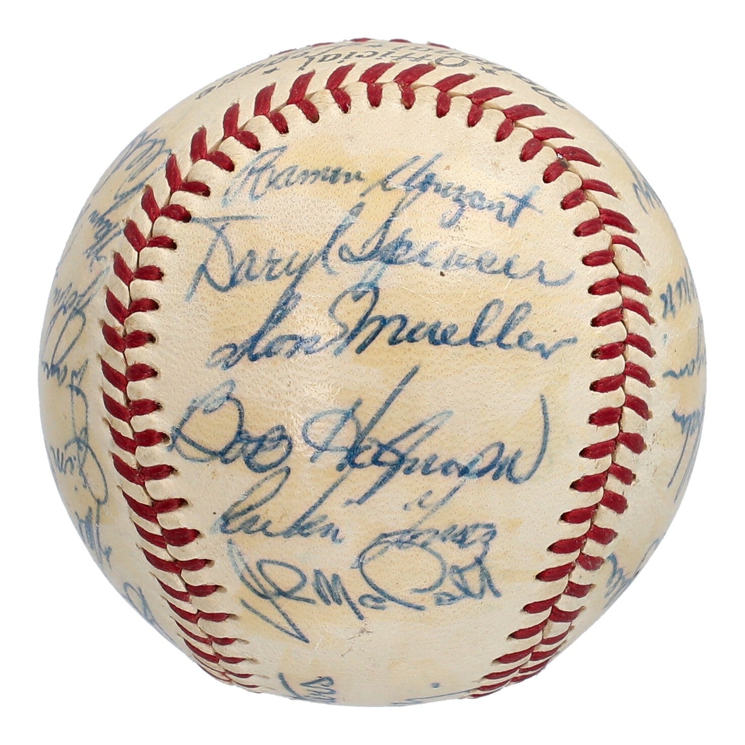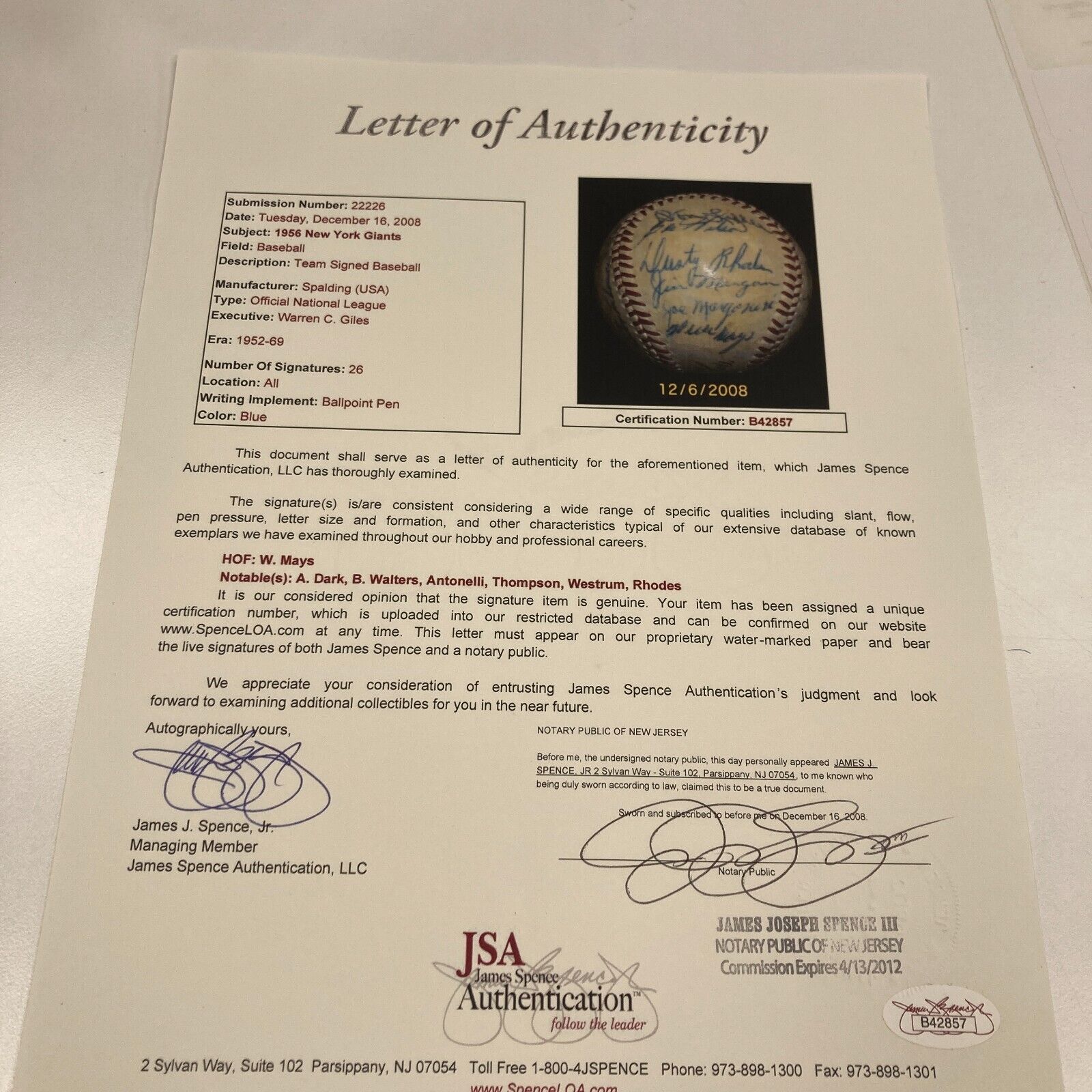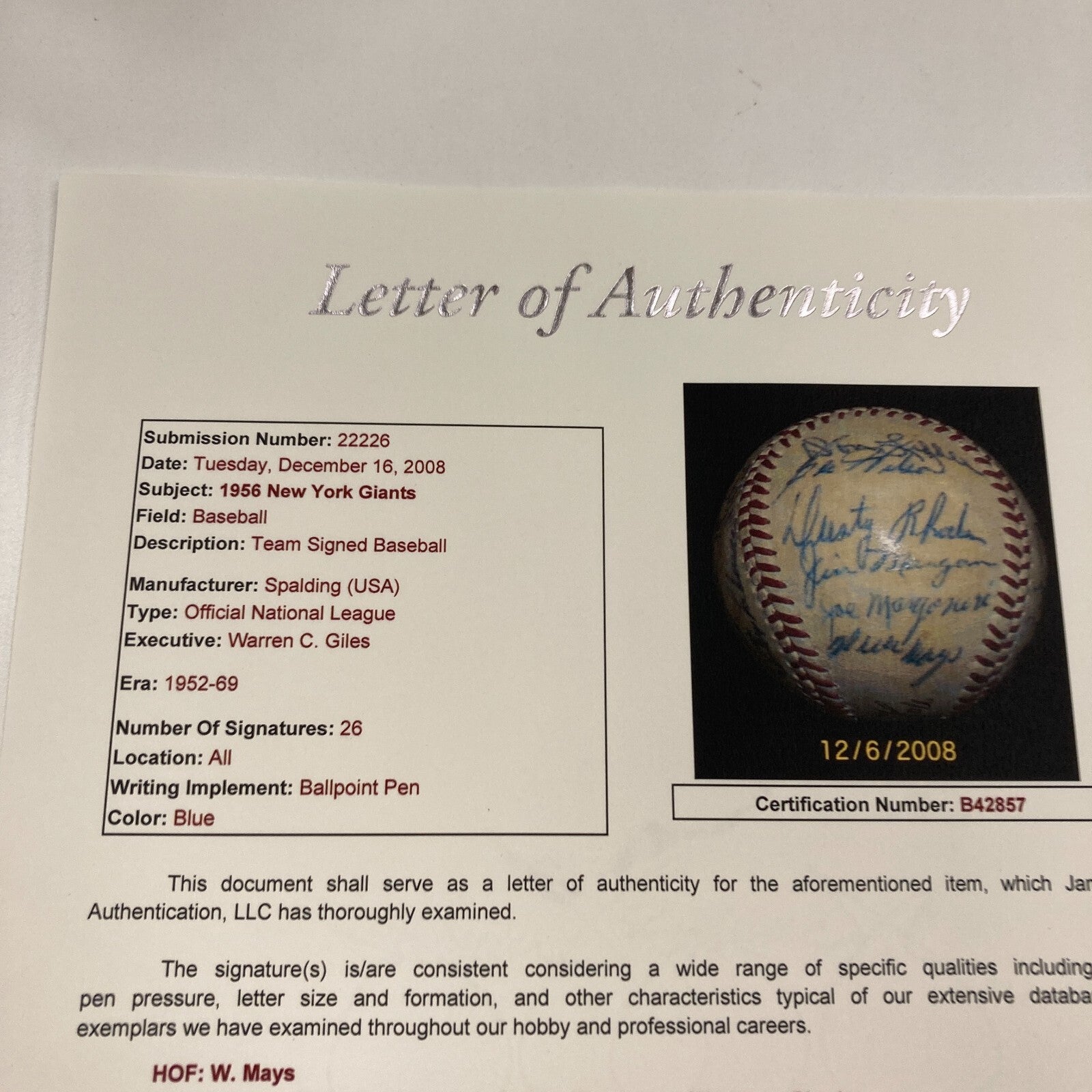 Offered is an Official National League Warren C. Giles baseball signed by 26 members of the 1956 New York Giants team. The ball features the signatures of Hall of Famer Willie Mays, with key signatures from Alvin Dark, Bill Rigney, Bucky Walters, Johnny Antonelli, Hank Thompson, Wes Westrum, Dusty Rhodes, Bob Lennon, Steve Ridzik, Daryl Spencer, Ramon Monzant, Jim Mangan and Don Mueller. All the signatures are authentic. There are NO clubhouse signatures. The ball comes with an LOA from JSA (B42857) for the signatures.