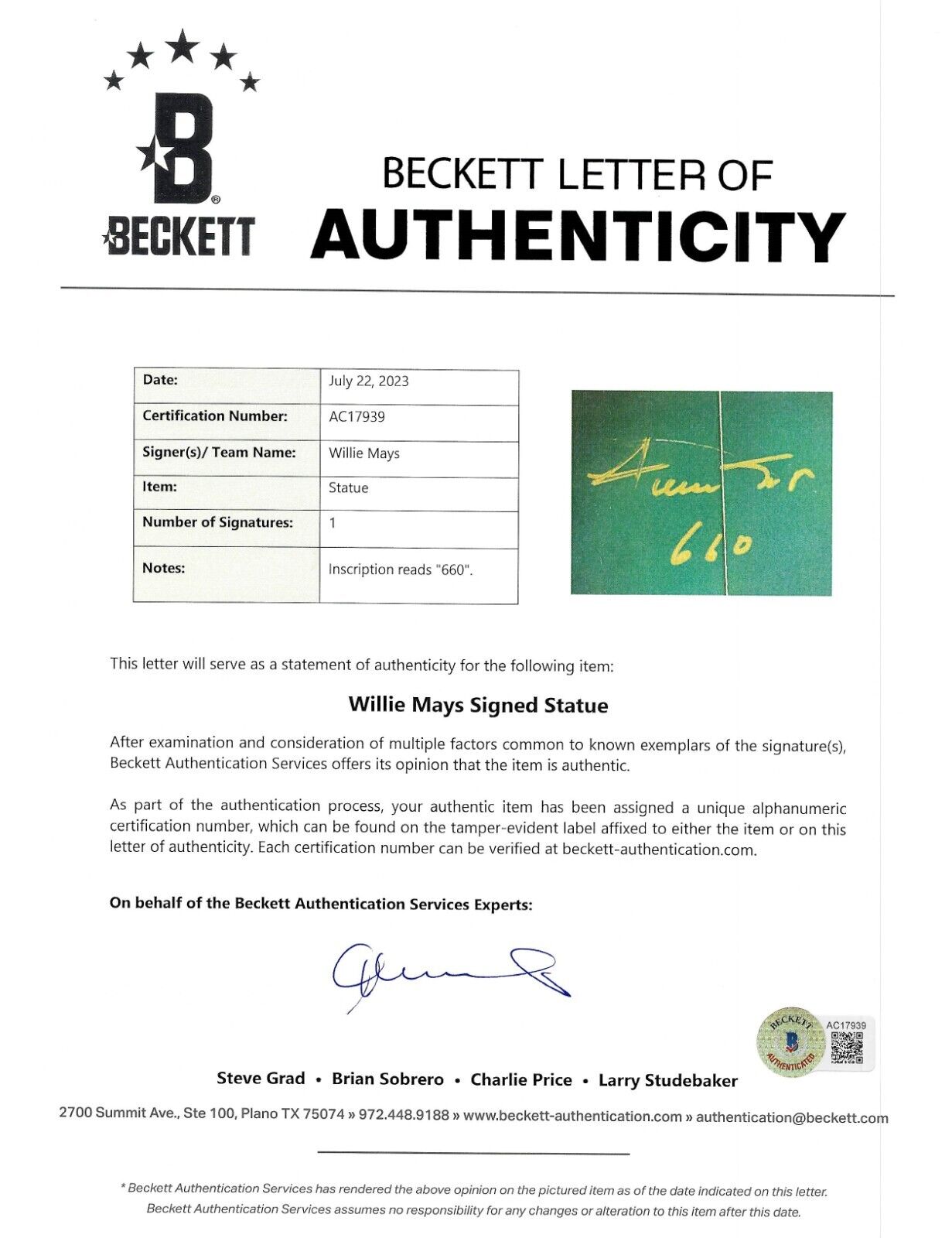 Willie Mays Autographed & Inscribed "The Catch" Figurine Display. Inscription reads "660" which is the number of homeruns Mays hit during his career. Accompanied by a Beckett Letter of Authenticity. Please note that one of the baseballs are detached from the statue but it can easily be glued back on.