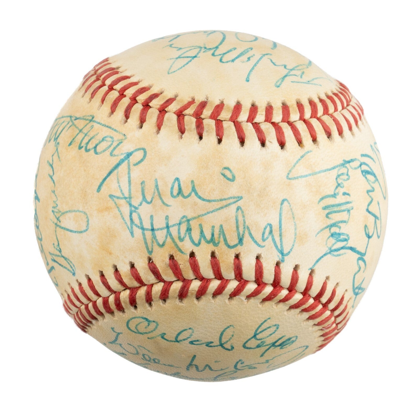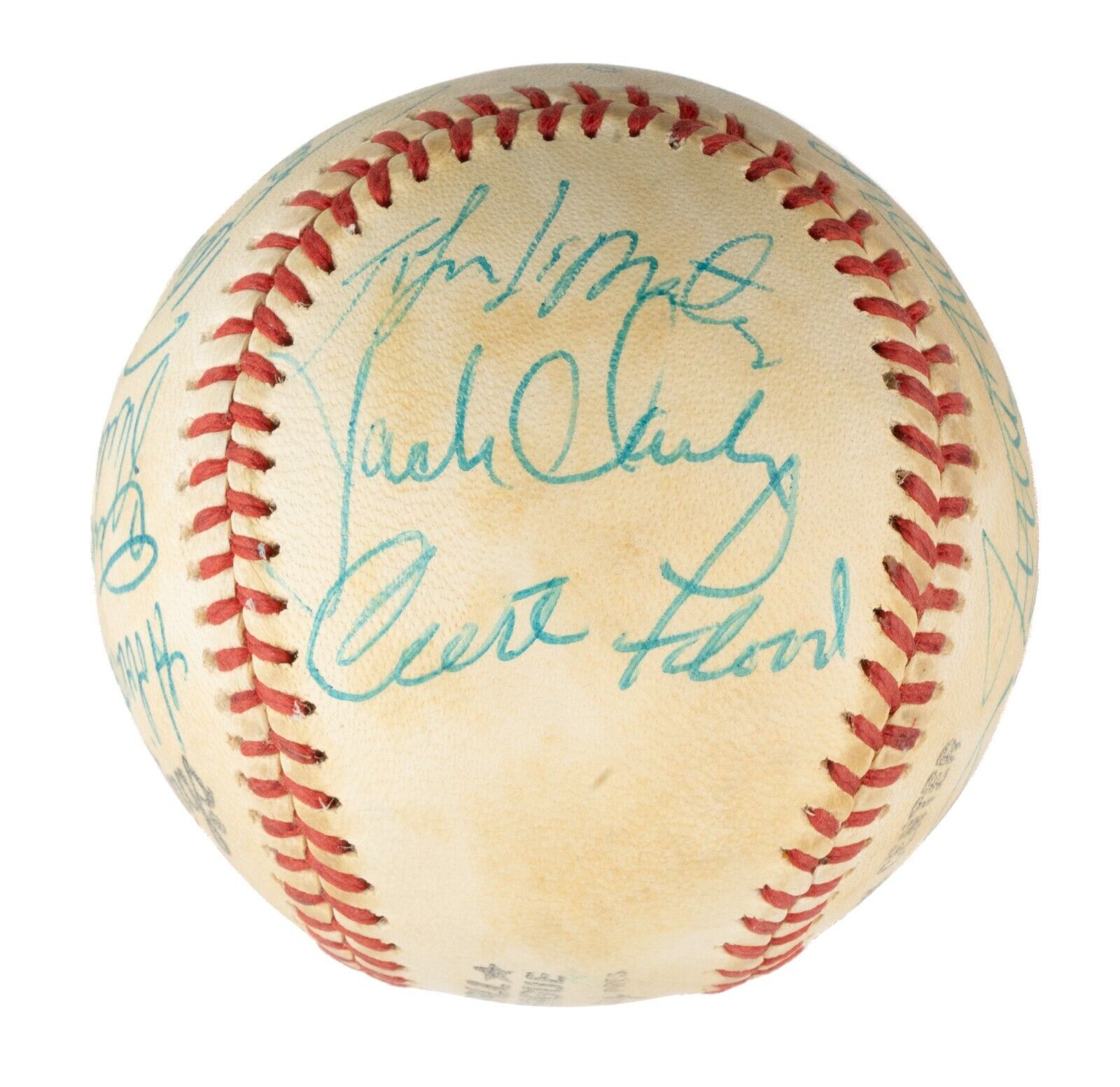 Official National League baseball (Feeney) signed in blue ink by the following 17 former members of the San Francisco Giants and Curt Flood. The 17 former Giants include Mays, Marichal (sweet spot), Cepeda, McCovey, Sauer, Larsen, Bressoud, Bryant, Clark, Davenport, Fuentes, Holland, Landrith, Lemaster, Maddox, Matthews Sr., and Sadek. Full LOA from PSA/DNA.