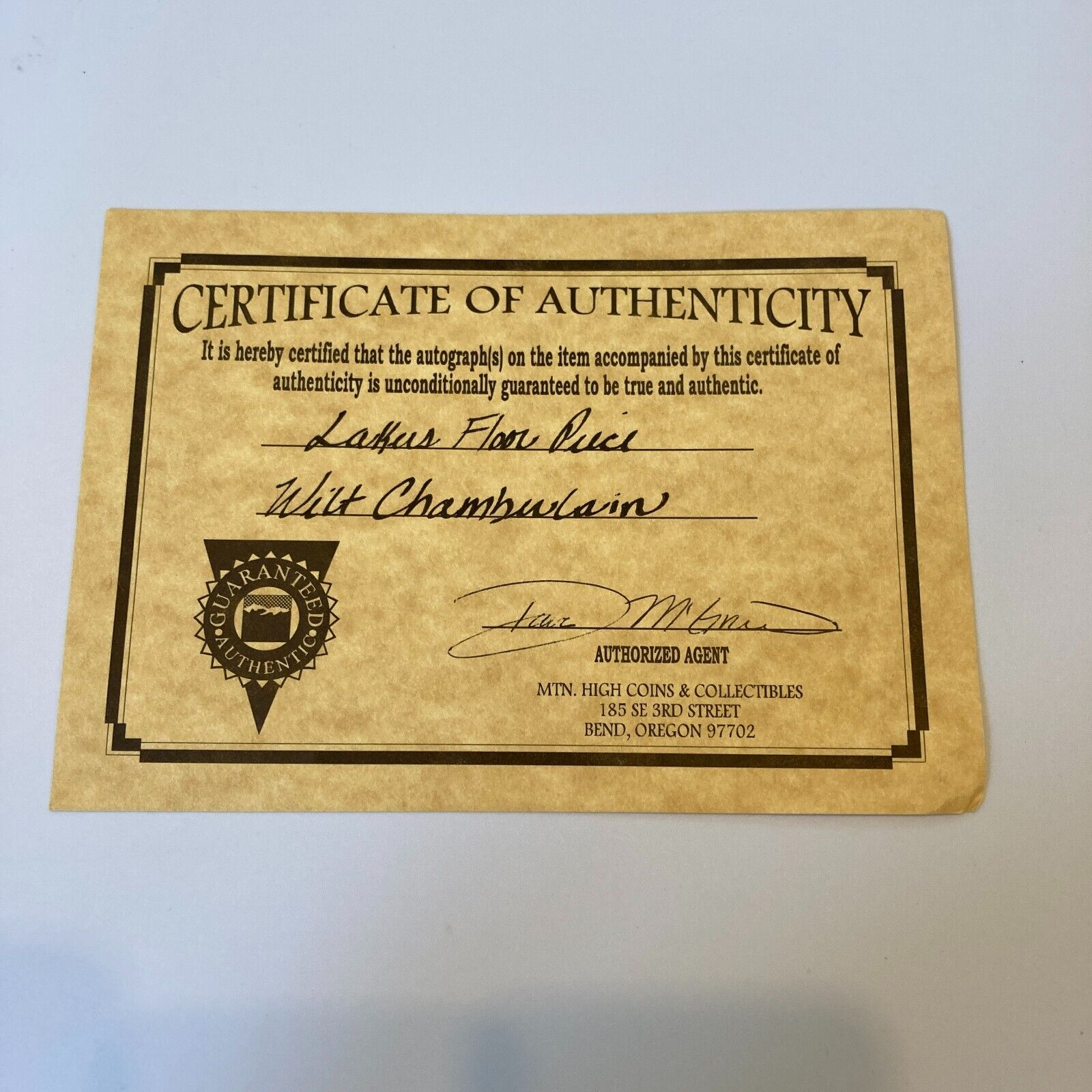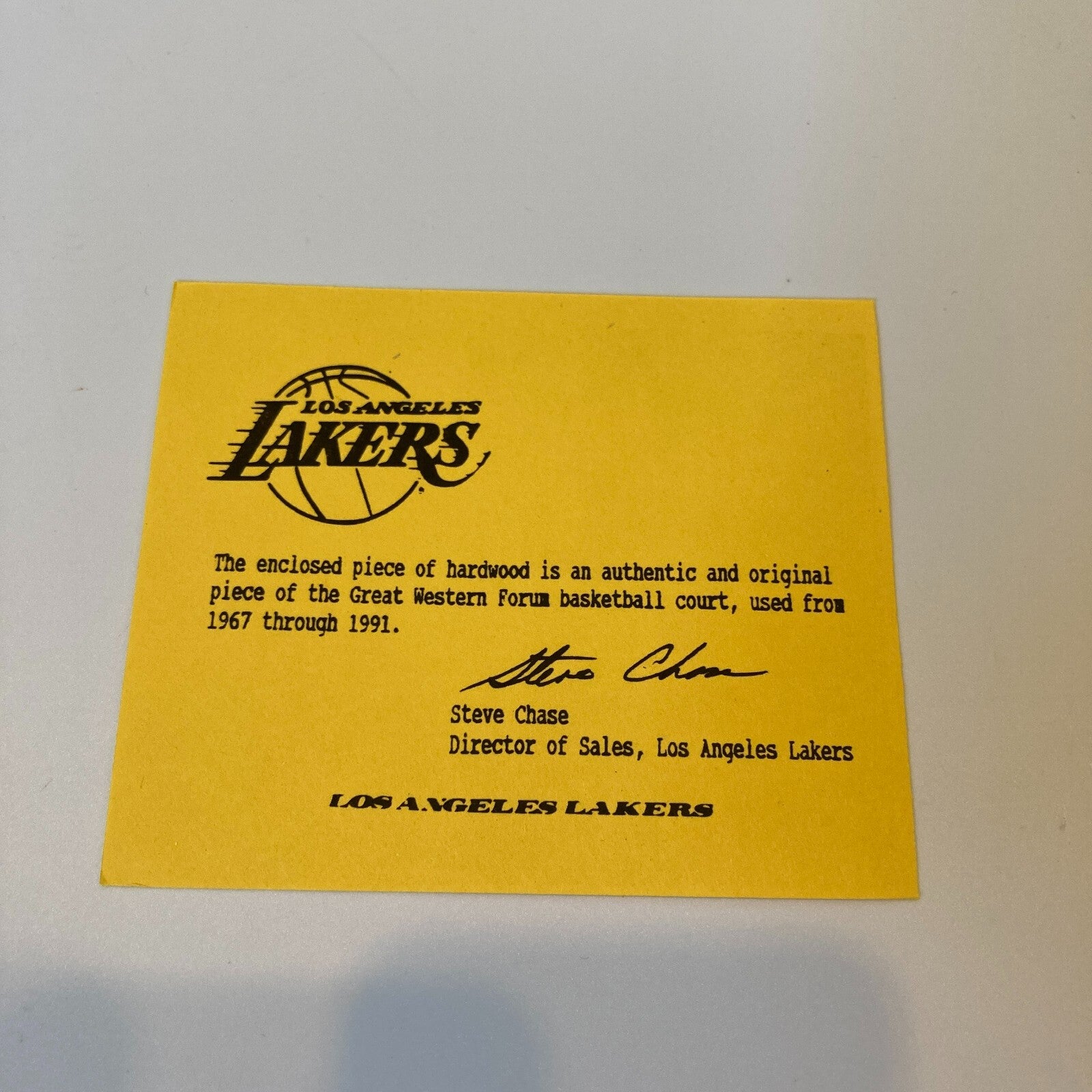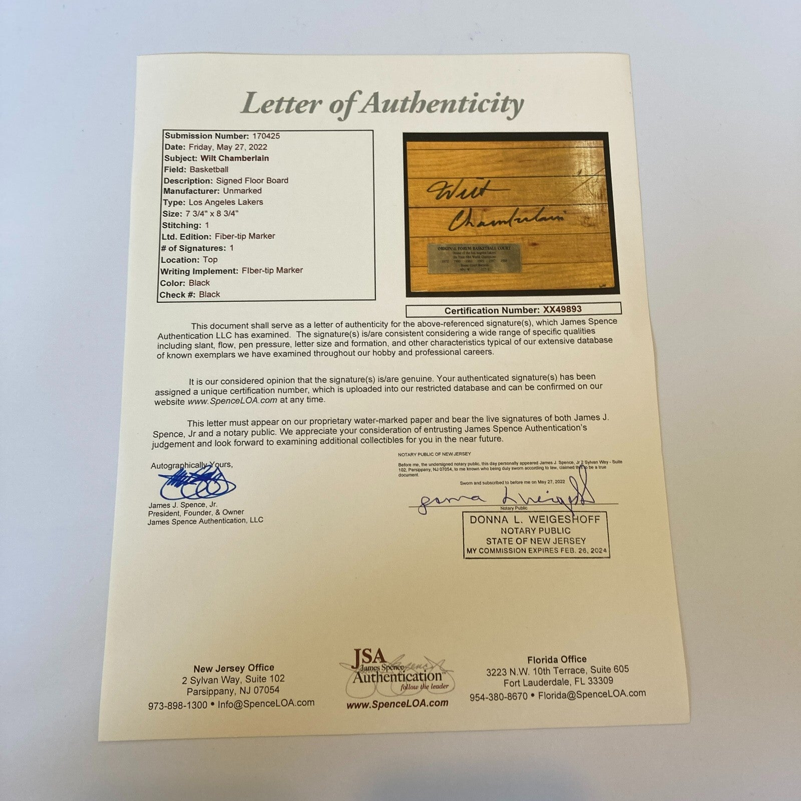 Offered is a large 8x9 (Approx) section of the Forum basketball court, home of the Los Angeles Lakers from 1967 to 1991. Signed in black sharpie by Wilt Chamberlain. Full letter COA from JSA and COA from Los Angeles Lakers.
